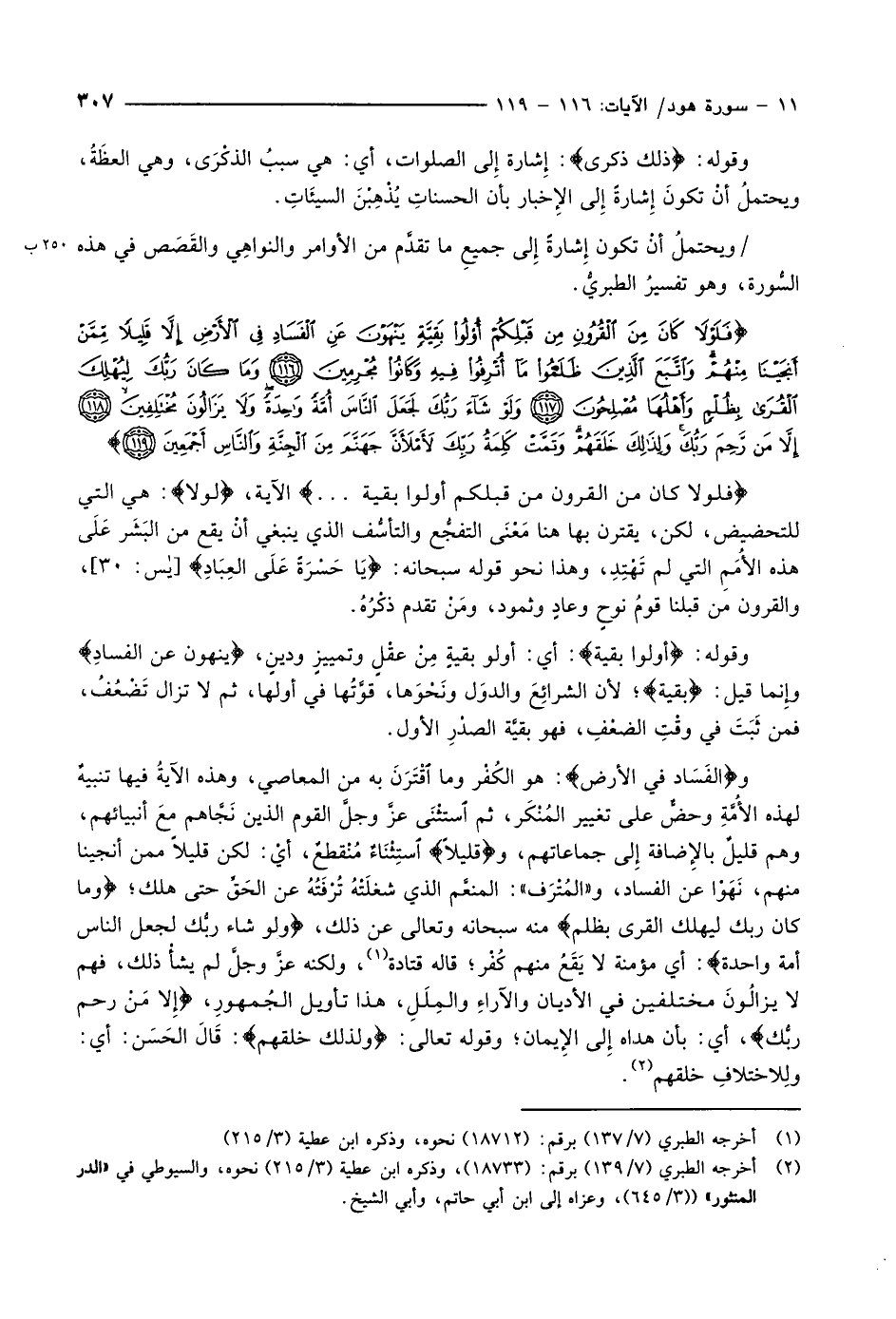 فَلَوْلا كانَ مِنَ الْقُرُونِ مِنْ قَبْلِكُمْ أُولُوا بَقِيَّةٍ يَنْهَوْنَ عَنِ الْفَسادِ فِي الْأَرْضِ إِلاَّ قَلِيلاً مِمَّنْ أَنْجَيْنا مِنْهُمْ وَاتَّبَعَ الَّذِينَ ظَلَمُوا ما أُتْرِفُوا فِيهِ وَكانُوا مُجْرِمِينَ (116) وَما كانَ رَبُّكَ لِيُهْلِكَ الْقُرى بِظُلْمٍ وَأَهْلُها مُصْلِحُونَ (117) وَلَوْ شاءَ رَبُّكَ لَجَعَلَ النَّاسَ أُمَّةً واحِدَةً وَلا يَزالُونَ مُخْتَلِفِينَ (118) إِلاَّ مَنْ رَحِمَ رَبُّكَ وَلِذلِكَ خَلَقَهُمْ وَتَمَّتْ كَلِمَةُ رَبِّكَ لَأَمْلَأَنَّ جَهَنَّمَ مِنَ الْجِنَّةِ وَالنَّاسِ أَجْمَعِينَ (119)