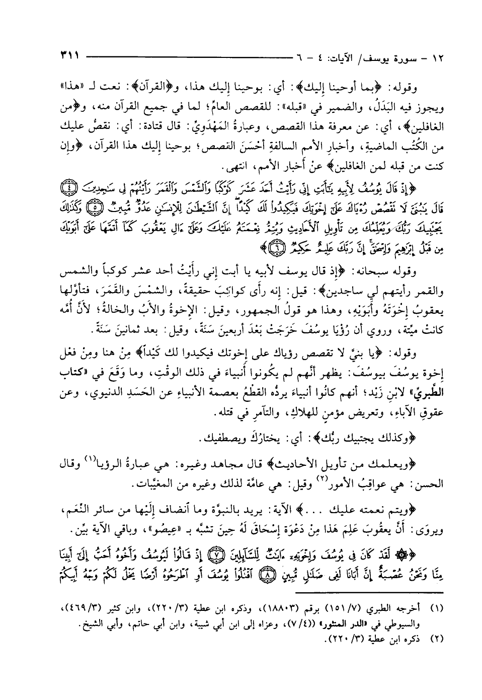 إِذْ قالَ يُوسُفُ لِأَبِيهِ يا أَبَتِ إِنِّي رَأَيْتُ أَحَدَ عَشَرَ كَوْكَباً وَالشَّمْسَ وَالْقَمَرَ رَأَيْتُهُمْ لِي ساجِدِينَ (4) قالَ يا بُنَيَّ لا تَقْصُصْ رُؤْياكَ عَلى إِخْوَتِكَ فَيَكِيدُوا لَكَ كَيْداً إِنَّ الشَّيْطانَ لِلْإِنْسانِ عَدُوٌّ مُبِينٌ (5) وَكَذلِكَ يَجْتَبِيكَ رَبُّكَ وَيُعَلِّمُكَ مِنْ تَأْوِيلِ الْأَحادِيثِ وَيُتِمُّ نِعْمَتَهُ عَلَيْكَ وَعَلى آلِ يَعْقُوبَ كَما أَتَمَّها عَلى أَبَوَيْكَ مِنْ قَبْلُ إِبْراهِيمَ وَإِسْحاقَ إِنَّ رَبَّكَ عَلِيمٌ حَكِيمٌ (6)