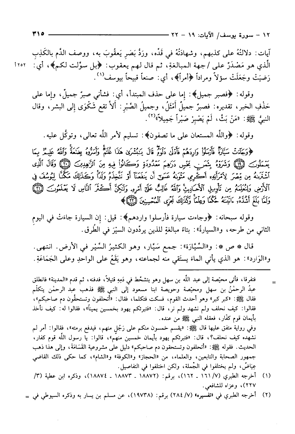 وقوله سبحانه: وَجاءَتْ سَيَّارَةٌ فَأَرْسَلُوا وارِدَهُمْ: قيل: إِن السيارة جاءَتْ في اليومِ الثاني من طرحه، و «السيارةُ» : بتاءُ مبالغةٍ للذين يردِّدون السيْرَ في الطُرق.