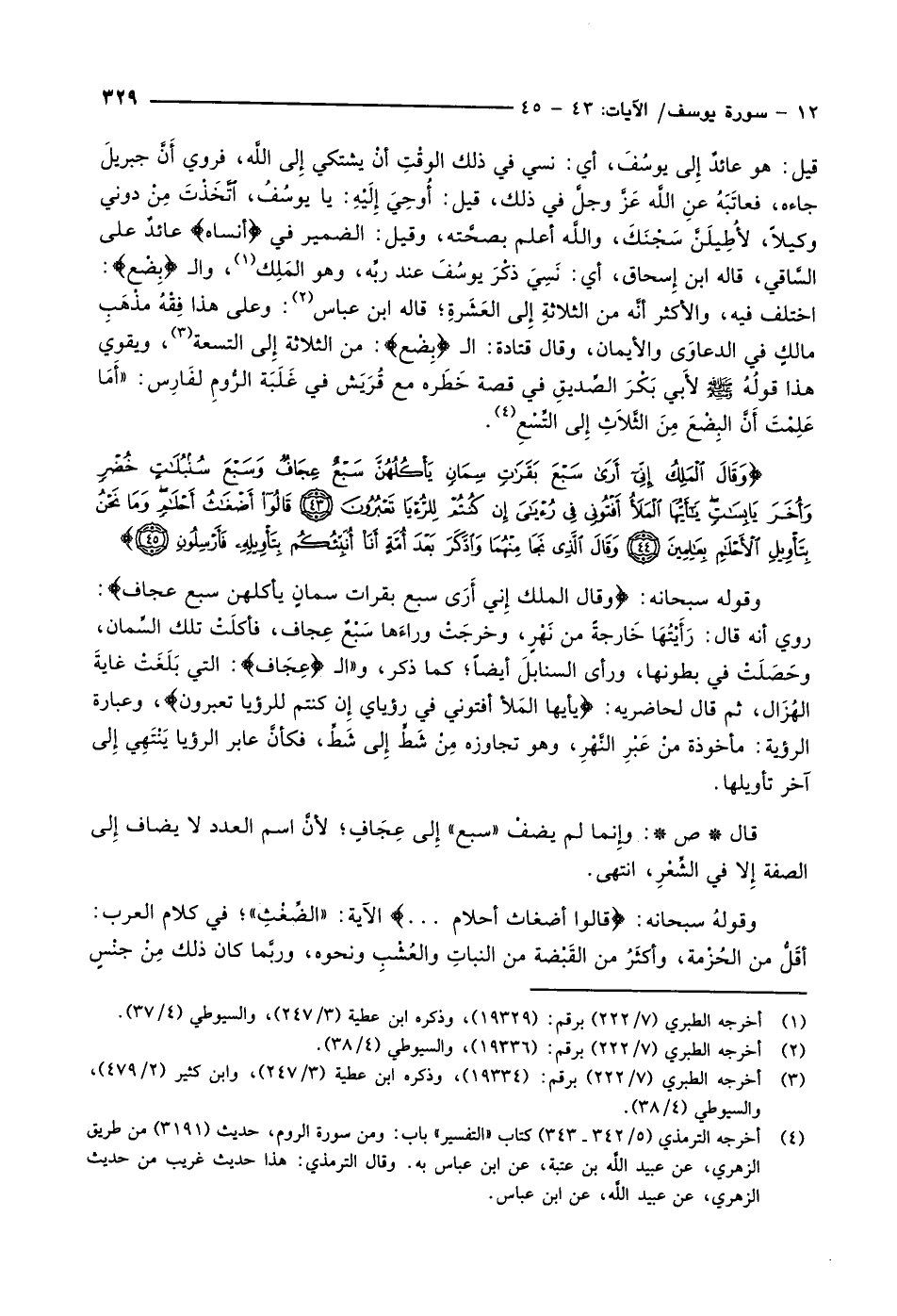 وَقالَ الْمَلِكُ إِنِّي أَرى سَبْعَ بَقَراتٍ سِمانٍ يَأْكُلُهُنَّ سَبْعٌ عِجافٌ وَسَبْعَ سُنْبُلاتٍ خُضْرٍ وَأُخَرَ يابِساتٍ يا أَيُّهَا الْمَلَأُ أَفْتُونِي فِي رُءْيايَ إِنْ كُنْتُمْ لِلرُّءْيا تَعْبُرُونَ (43) قالُوا أَضْغاثُ أَحْلامٍ وَما نَحْنُ بِتَأْوِيلِ الْأَحْلامِ بِعالِمِينَ (44) وَقالَ الَّذِي نَجا مِنْهُما وَادَّكَرَ بَعْدَ أُمَّةٍ أَنَا أُنَبِّئُكُمْ بِتَأْوِيلِهِ فَأَرْسِلُونِ (45)