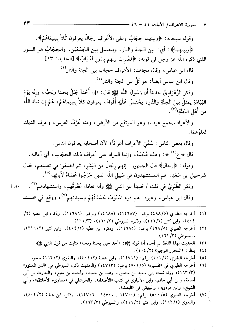 وقوله سبحانه: وَبَيْنَهُما حِجابٌ وَعَلَى الْأَعْرافِ رِجالٌ يَعْرِفُونَ كُلًّا بِسِيماهُمْ.