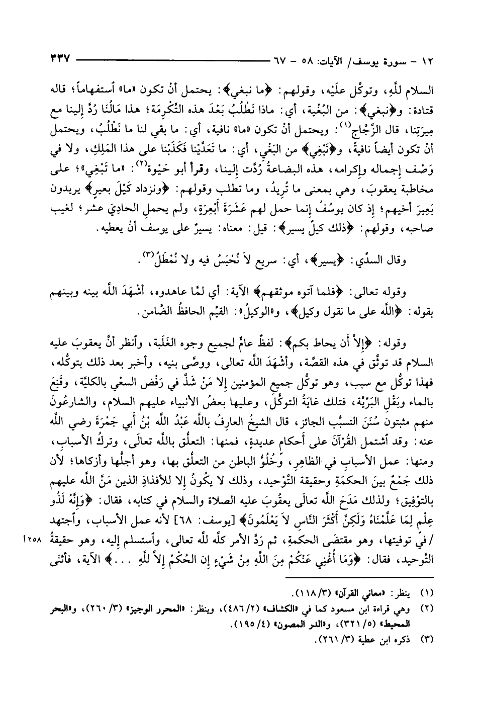 وقوله: إِلَّا أَنْ يُحاطَ بِكُمْ: لفظٌ عامٌّ لجميع وجوه الغَلَبة، وانظر أنَّ يعقوبَ عليه السلام قد توثَّق في هذه القصَّة، وأشْهَدَ اللَّه تعالى، ووصَّى بنيه، وأخبر بعد ذلك بتوكُّله، فهذا توكُّل مع سبب، وهو توكُّل جميعِ المؤمنين إِلا مَنْ شَذَّ في رَفْض السعْي بالكليَّة، وقَنِعَ بالماء وبَقْلِ البَرِّيَّة، فتلك غايَةُ التوكُّل، وعليها بعضُ الأنبياء عليهم السلام، والشارعُونَ منهم مثبتون سُنَنَ التسبُّب الجائز، قال الشيخ العارف بالله عبد الله بن أبي جَمْرَةَ رضي اللَّه عنه: وقد اشتمل القُرْآنَ على أَحكامٍ عديدةٍ، فمنها: التعلُّق باللَّه تعالَى، وتركُ الأسبابِ، ومنها: عمل الأسبابِ في الظاهِرِ، وخُلُوُّ الباطن من التعلُّق بها، وهو أجلُّها وأزكاها لأن ذلك جَمْعٌ بينَ الحكمَةِ وحقيقة التَّوْحيد، وذلك لا يكُونُ إِلا للأفذاذِ الذين مَنَّ اللَّه عليهم بالتوْفِيق ولذلك مَدَحَ اللَّه تعالى يعقوب عليه الصلاة والسلام في كتابه، فقال: وَإِنَّهُ لَذُو عِلْمٍ لِما عَلَّمْناهُ وَلكِنَّ أَكْثَرَ النَّاسِ لاَ يَعْلَمُونَ [يوسف: 68] لأنه عمل الأسباب، واجتهد/ في توفيتها، وهو مقتضَى الحكمةِ، ثم رَدَّ الأمر كلَّه للَّه تعالى، واستسلم إِليه، وهو حقيقةُ التَّوحيد، فقال: وَما أُغْنِي عَنْكُمْ مِنَ اللَّهِ مِنْ شَيْءٍ إِنِ الْحُكْمُ إِلَّا لِلَّهِ ... الآية، فأثنى