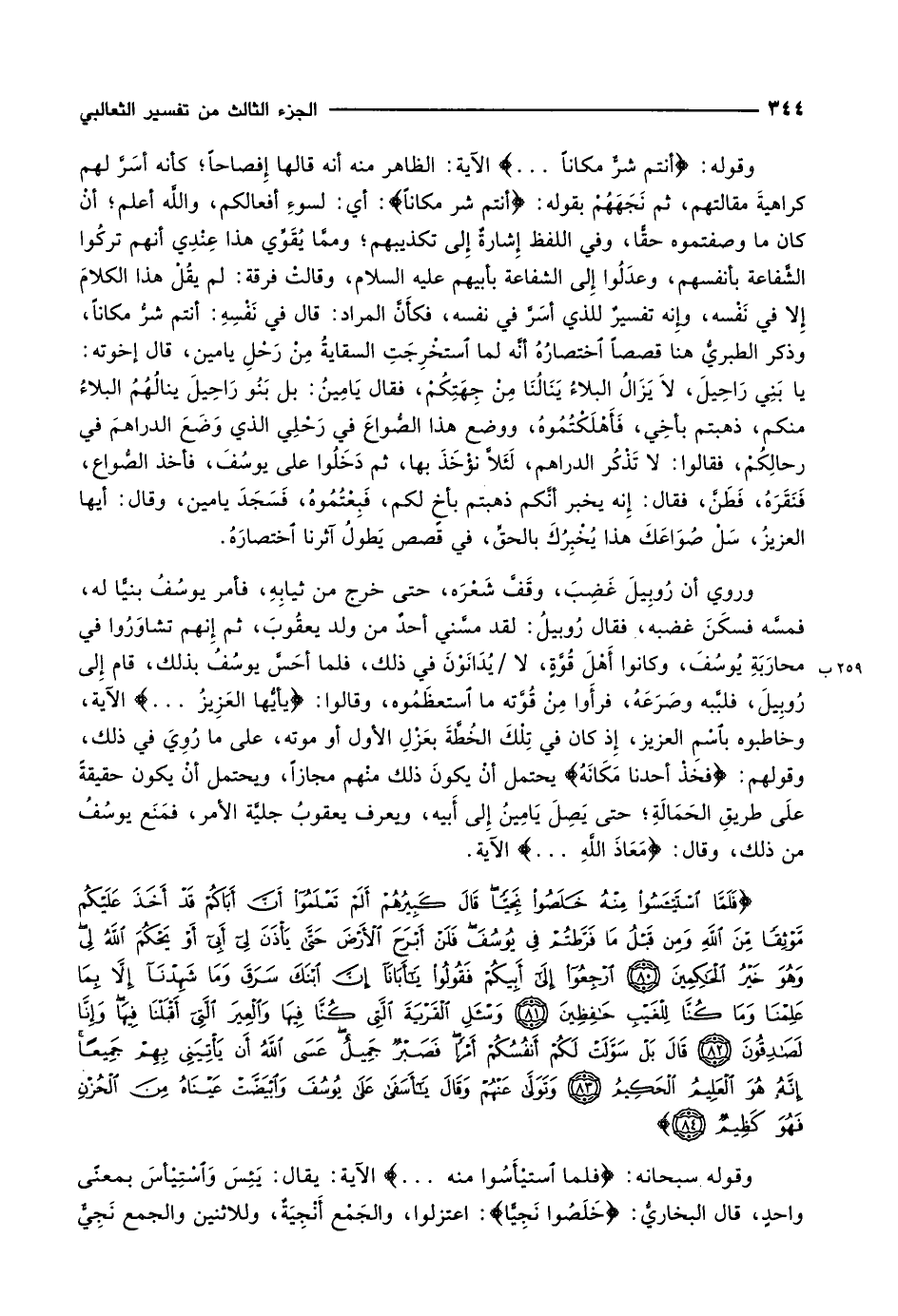 وقوله: أَنْتُمْ شَرٌّ مَكاناً ... الآية: الظاهر منه أنه قالها إِفصاحاً كأنه أسَرَّ لهم كراهيةَ مقالتهم، ثم نجَهَهُمْ بقوله: أَنْتُمْ شَرٌّ مَكاناً: أي: لسوءِ أفعالكم، واللَّه أعلم أنْ كان ما وصفتموه حقًّا، وفي اللفظ إِشارةٌ إِلى تكذيبهم وممَّا يُقَوِّي هذا عِنْدِي أنهم تركُوا الشَّفاعة بأنفسهم، وعدَلُوا إِلى الشفاعة بأبيهم عليه السلام، وقالتْ فرقة: لم يقُلْ هذا الكلامَ إِلا في نَفْسه، وإِنه تفسيرٌ للذي أسَرَّ في نفسه، فكأَنَّ المراد: قال في نَفْسِهِ: أنتم شرُّ مكاناً، وذكر الطبريُّ هنا قصصاً اختصاره أنَّه لما استخرجت السقايةُ مِنْ رَحْلِ يامين، قال إخوته: