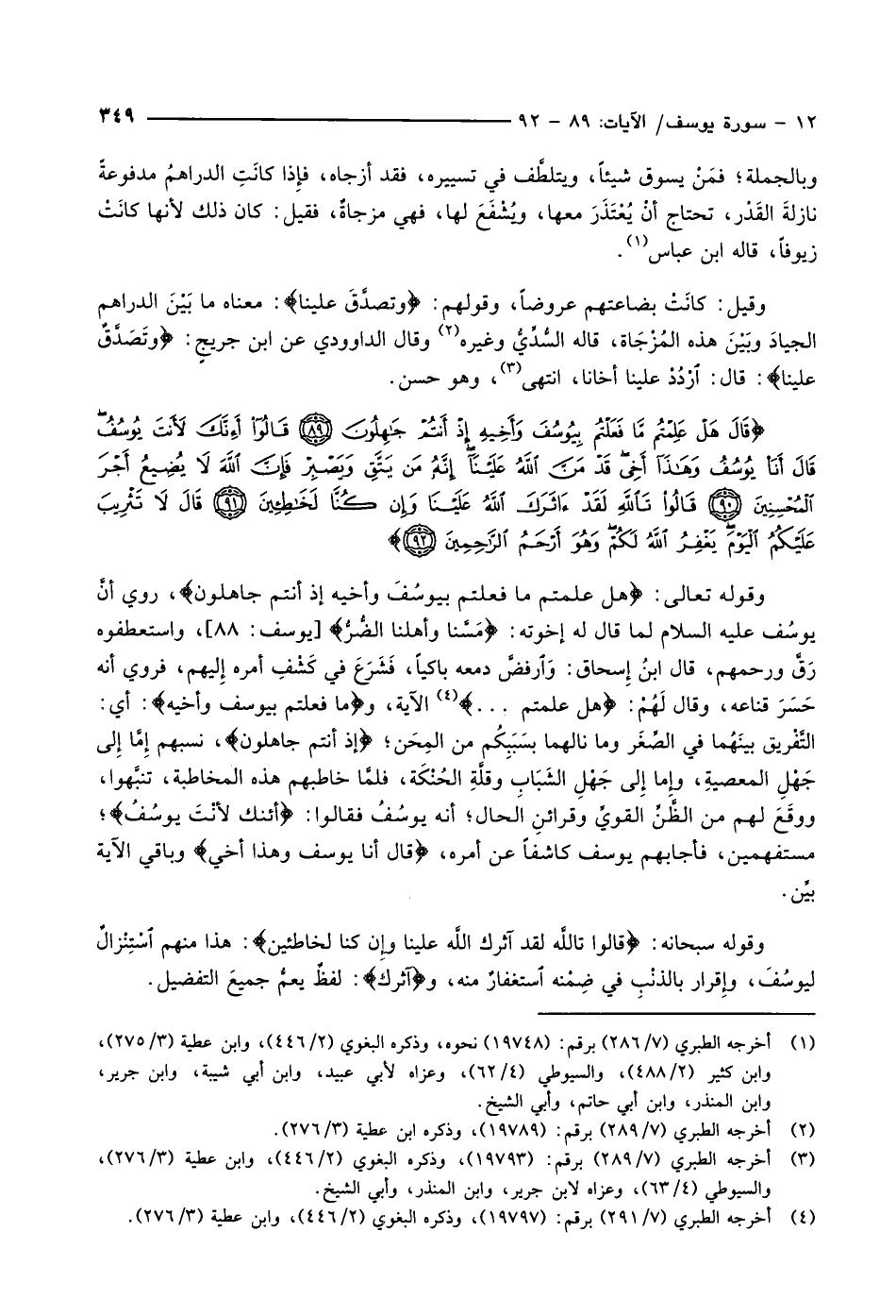 قالَ هَلْ عَلِمْتُمْ مَّا فَعَلْتُمْ بِيُوسُفَ وَأَخِيهِ إِذْ أَنْتُمْ جاهِلُونَ (89) قالُوا أَإِنَّكَ لَأَنْتَ يُوسُفُ قالَ أَنَا يُوسُفُ وَهذا أَخِي قَدْ مَنَّ اللَّهُ عَلَيْنا إِنَّهُ مَنْ يَتَّقِ وَيَصْبِرْ فَإِنَّ اللَّهَ لا يُضِيعُ أَجْرَ الْمُحْسِنِينَ (90) قالُوا تَاللَّهِ لَقَدْ آثَرَكَ اللَّهُ عَلَيْنا وَإِنْ كُنَّا لَخاطِئِينَ (91) قالَ لا تَثْرِيبَ عَلَيْكُمُ الْيَوْمَ يَغْفِرُ اللَّهُ لَكُمْ وَهُوَ أَرْحَمُ الرَّاحِمِينَ (92)
