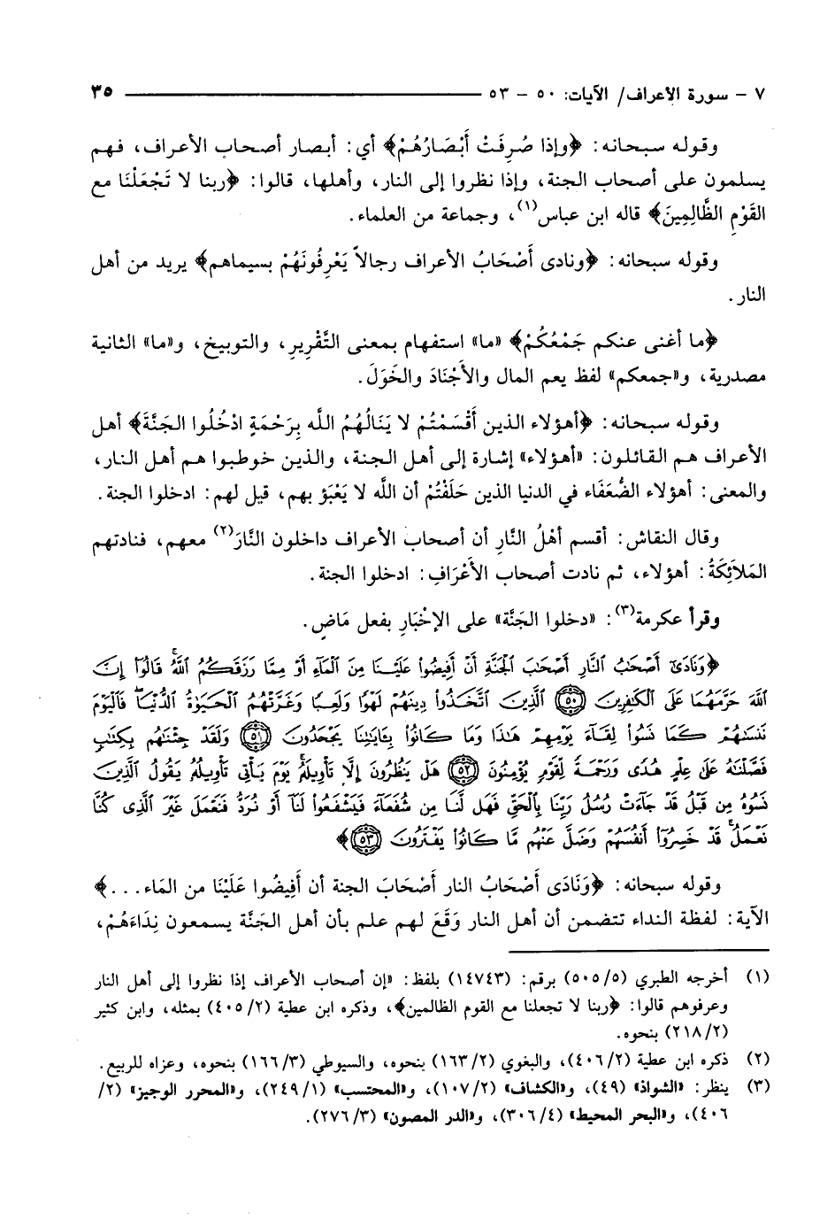 (1) أخرجه الطبري (5/ 505) برقم: (14743) بلفظ: «إن أصحاب الأعراف إذا نظروا إلى أهل النار وعرفوهم قالوا: رَبَّنا لاَ تَجْعَلْنا مَعَ الْقَوْمِ الظَّالِمِينَ، وذكره ابن عطية (2/ 405) بمثله، وابن كثير (2/ 218) بنحوه.