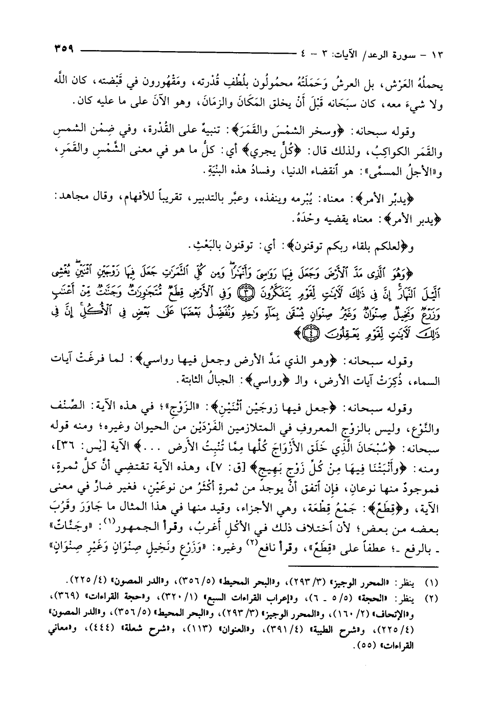 وَهُوَ الَّذِي مَدَّ الْأَرْضَ وَجَعَلَ فِيها رَواسِيَ وَأَنْهاراً وَمِنْ كُلِّ الثَّمَراتِ جَعَلَ فِيها زَوْجَيْنِ اثْنَيْنِ يُغْشِي اللَّيْلَ النَّهارَ إِنَّ فِي ذلِكَ لَآياتٍ لِقَوْمٍ يَتَفَكَّرُونَ (3) وَفِي الْأَرْضِ قِطَعٌ مُتَجاوِراتٌ وَجَنَّاتٌ مِنْ أَعْنابٍ وَزَرْعٌ وَنَخِيلٌ صِنْوانٌ وَغَيْرُ صِنْوانٍ يُسْقى بِماءٍ واحِدٍ وَنُفَضِّلُ بَعْضَها عَلى بَعْضٍ فِي الْأُكُلِ إِنَّ فِي ذلِكَ لَآياتٍ لِقَوْمٍ يَعْقِلُونَ (4)