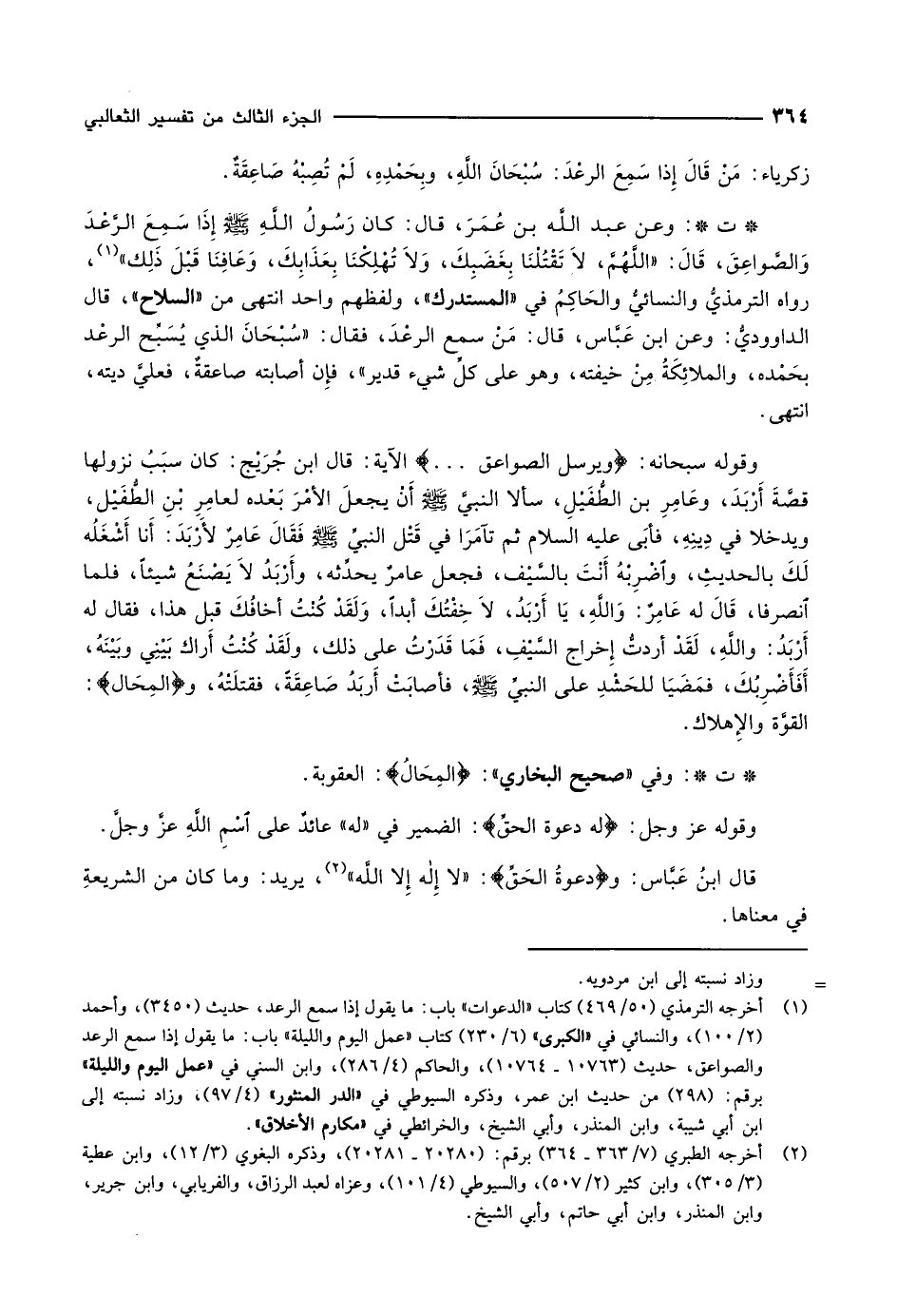ت: وعن عبد اللَّه بن عُمَرَ، قال: كان رَسُولُ الله صلّى الله عليه وسلّم إِذَا سَمِعَ الرَّعْدَ وَالصَّواعِقَ، قَالَ: «اللَّهُمَّ، لاَ تَقْتُلْنَا بِغَضَبِكَ، وَلاَ تُهْلِكْنَا بِعَذَابِكَ، وَعَافِنَا قَبْلَ ذَلِك» «1» ، رواه الترمذيُّ والنسائيُّ والحَاكِمُ في «المستدرك» ، ولفظهم واحد انتهى من «السلاح» ، قال الداوديّ: وعن ابن عَبَّاس، قال: مَنْ سمع الرعْدَ، فقال: «سُبْحَانَ الذي يُسَبِّح الرعْد بحَمْده، والملائِكَةُ مِنْ خيفته، وهو على كلِّ شيء قدير» ، فإِن أصابته صاعقةٌ، فعليَّ ديته، انتهى.