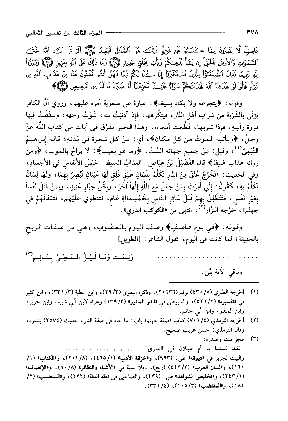 وقوله: يَتَجَرَّعُهُ وَلا يَكادُ يُسِيغُهُ: عبارةٌ عن صعوبة أمره عليهم، وروي أنَّ الكافر يؤتَى بالشَّرْبة من شراب أهْل النَّار، فيتكَّرهها، فإِذا أدنيَتْ منه، شَوَتْ وجهه، وسقَطَتْ فيها فروة رأسِهِ، فإِذا شربها، قَطَّعت أمعاءه، وهذا الخبر مفرَّق في آيات من كتاب اللَّه عزَّ وجلَّ، وَيَأْتِيهِ الْمَوْتُ مِنْ كُلِّ مَكانٍ، أي: مِنْ كل شعرة في بَدَنِهِ قاله إِبراهيمُ التَّيْمِيُّ «1» ، وقيل: مِنْ جميع جهاته السِّتِّ، وَما هُوَ بِمَيِّتٍ: لا يراحُ بالموت، وَمِنْ وَرائِهِ عَذابٌ غَلِيظٌ قال الفُضَيْلُ بْنُ عِيَاضٍ: العذابُ الغليظ: حَبْسُ الأنفاسِ في الأجسادِ، وفي الحديث: «تَخْرُجُ عُنُقٌ مِنَ النَّارِ تَكَلَّمُ بِلَسَانٍ طَلِقٍ ذَلِقٍ لَهَا عَيْنَانِ تُبْصِرُ بِهِمَا، وَلَهَا لِسَانٌ تَكَلَّمُ بِهِ، فَتَقُولُ: إِنِّي أُمِرْتُ بِمَنْ جَعَلَ مَعَ اللَّهِ إلها آخَرَ، وبِكُلِّ جَبَّارٍ عَنِيدٍ، وبِمَنْ قَتَلَ نَفْساً بِغَيْرِ نَفْسٍ، فَتَنْطَلِقُ بِهِمْ قَبْلَ سَائِرِ النَّاسِ بِخَمْسِمِائَةِ عَامٍ، فتنطوي علَيْهم، فتقذفُهُمْ في جهنَّم» ، خرَّجه البزَّار «2» ، انتهى من «الكوكب الدري» .