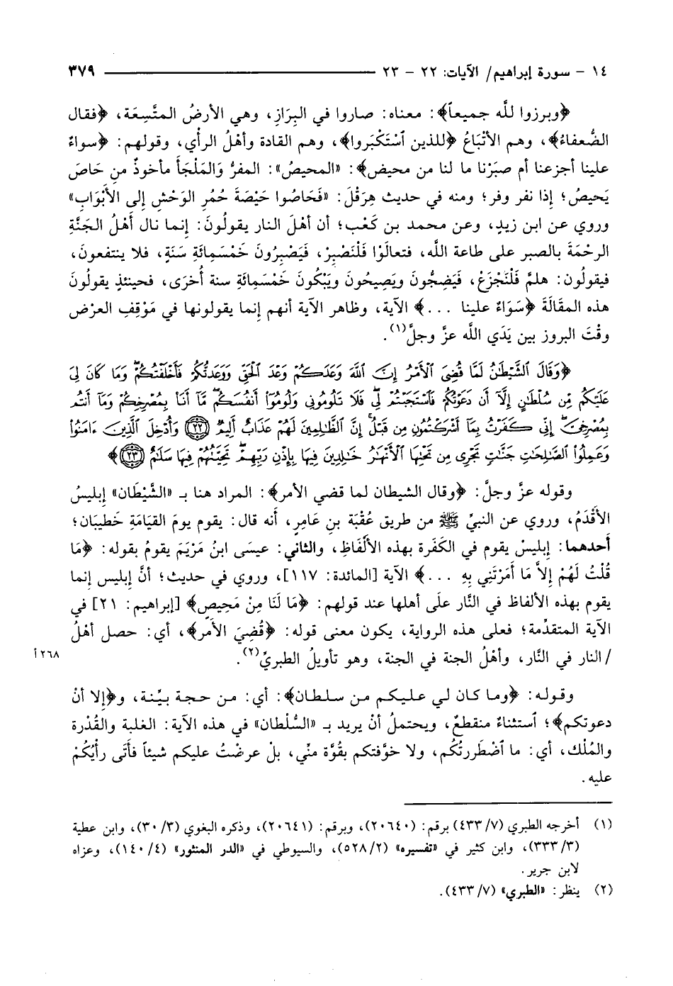 وَبَرَزُوا لِلَّهِ جَمِيعاً: معناه: صاروا في البِرَازِ، وهي الأرضُ المتَّسِعَة، فَقالَ الضُّعَفاءُ، وهم الأتْبَاعُ لِلَّذِينَ اسْتَكْبَرُوا، وهم القادة وأهْلُ الرأْي، وقولهم: سَواءٌ عَلَيْنا أَجَزِعْنا أَمْ صَبَرْنا مَا لَنا مِنْ مَحِيصٍ: «المحيصُ» : المفرُّ وَالمَلْجَأَ مأخوذٌ منِ حَاصَ يَحيصُ إِذا نفر وفر ومنه في حديث هِرَقْلَ: «فَحَاصُوا حَيْصَةَ حُمُرِ الوَحْشِ إِلى الأَبْوَابِ» وروي عن ابن زيدٍ، وعن محمد بن كَعْب أن أهْلَ النار يقولُونَ: إِنما نال أَهْلُ الجَنَّةِ الرحْمَةَ بالصبر على طاعة اللَّه، فتعالَوْا فَلْنَصْبِرْ، فَيَصْبِرُونَ خَمْسَمِائَةِ سَنَةٍ، فلا ينتفعونَ، فيقولُون: هلمَّ فَلْنَجْزَعْ، فَيَضِجُّونَ ويَصِيحُونَ ويَبْكُونَ خَمْسَمِائَةِ سنة أُخرَى، فحينئذٍ يقولُونَ هذه المقَالَةَ سَواءٌ عَلَيْنا ... الآية، وظاهر الآية أنهم إِنما يقولونها في مَوْقِفِ العرْض وقْتَ البروز بين يدي الله عزّ وجلّ «1» .