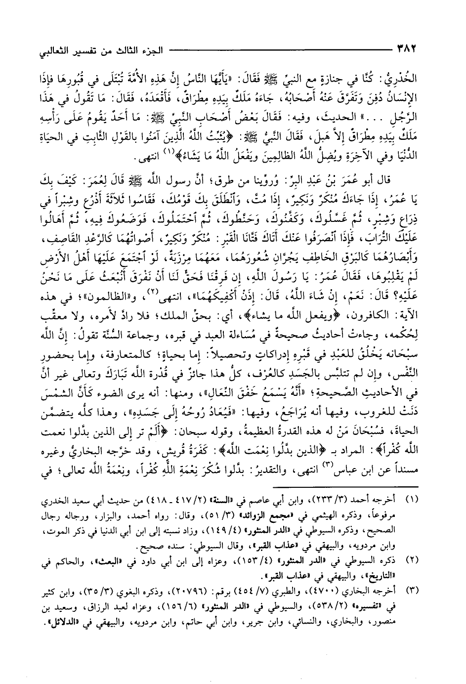 (2) ذكره السيوطي في «الدر المنثور» (4/ 153) ، وعزاه إلى ابن أبي داود في «البعث» ، والحاكم في «التاريخ» ، والبيهقي في «عذاب القبر» .
