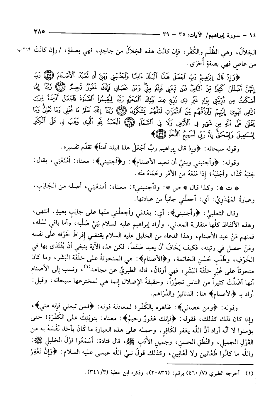 وَإِذْ قالَ إِبْراهِيمُ رَبِّ اجْعَلْ هَذَا الْبَلَدَ آمِناً وَاجْنُبْنِي وَبَنِيَّ أَنْ نَعْبُدَ الْأَصْنامَ (35) رَبِّ إِنَّهُنَّ أَضْلَلْنَ كَثِيراً مِنَ النَّاسِ فَمَنْ تَبِعَنِي فَإِنَّهُ مِنِّي وَمَنْ عَصانِي فَإِنَّكَ غَفُورٌ رَحِيمٌ (36) رَبَّنا إِنِّي أَسْكَنْتُ مِنْ ذُرِّيَّتِي بِوادٍ غَيْرِ ذِي زَرْعٍ عِنْدَ بَيْتِكَ الْمُحَرَّمِ رَبَّنا لِيُقِيمُوا الصَّلاةَ فَاجْعَلْ أَفْئِدَةً مِنَ النَّاسِ تَهْوِي إِلَيْهِمْ وَارْزُقْهُمْ مِنَ الثَّمَراتِ لَعَلَّهُمْ يَشْكُرُونَ (37) رَبَّنا إِنَّكَ تَعْلَمُ ما نُخْفِي وَما نُعْلِنُ وَما يَخْفى عَلَى اللَّهِ مِنْ شَيْءٍ فِي الْأَرْضِ وَلا فِي السَّماءِ (38) الْحَمْدُ لِلَّهِ الَّذِي وَهَبَ لِي عَلَى الْكِبَرِ إِسْماعِيلَ وَإِسْحاقَ إِنَّ رَبِّي لَسَمِيعُ الدُّعاءِ (39)