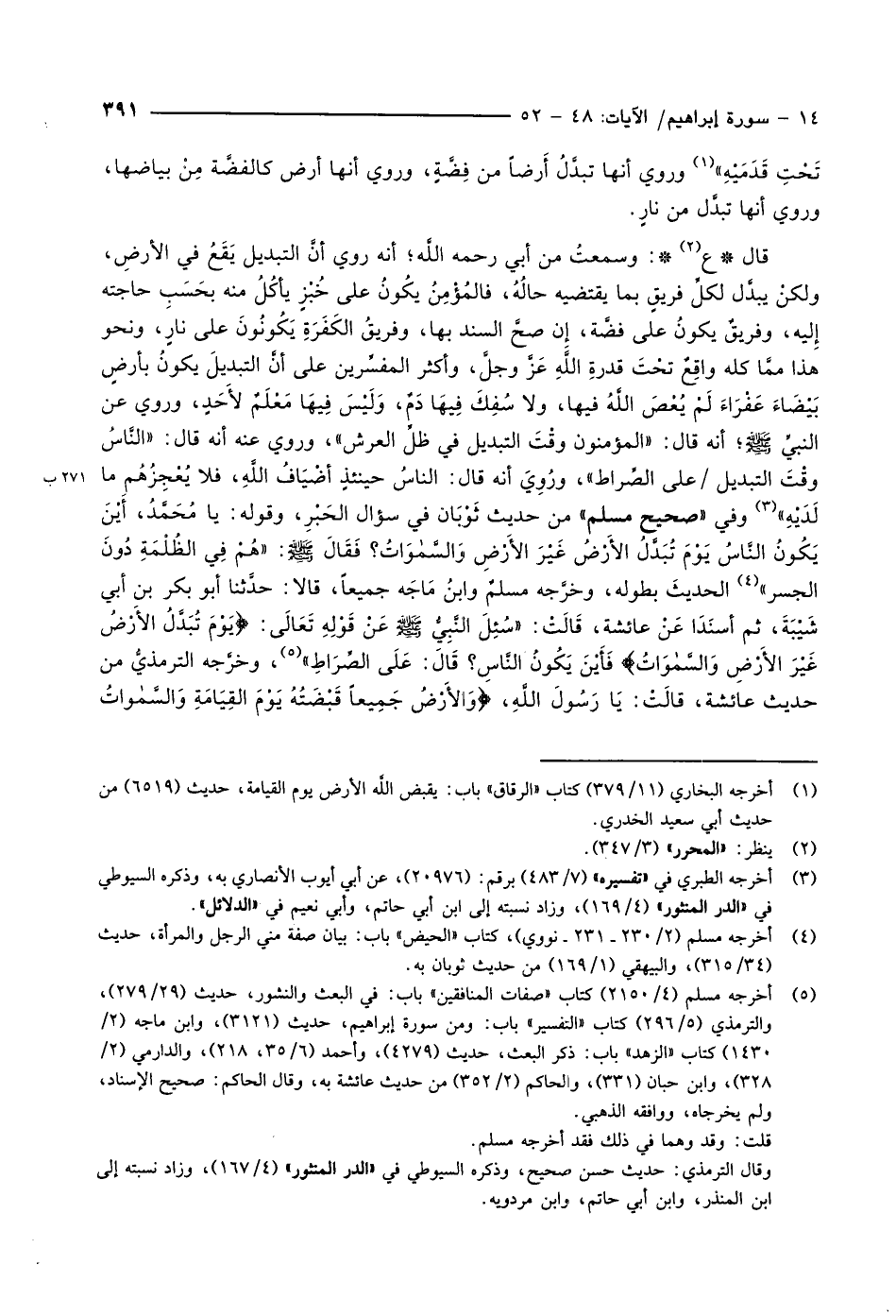 (5) أخرجه مسلم (4/ 2150) كتاب «صفات المنافقين» باب: في البعث والنشور، حديث (29/ 279) ، والترمذي (5/ 296) كتاب «التفسير» باب: ومن سورة إبراهيم، حديث (3121) ، وابن ماجه (2/ 1430) كتاب «الزهد» باب: ذكر البعث، حديث (4279) ، وأحمد (6/ 35، 218) ، والدارمي (2/ 328) ، وابن حبان (331) ، والحاكم (2/ 352) من حديث عائشة به، وقال الحاكم: صحيح الإسناد، ولم يخرجاه، ووافقه الذهبي.