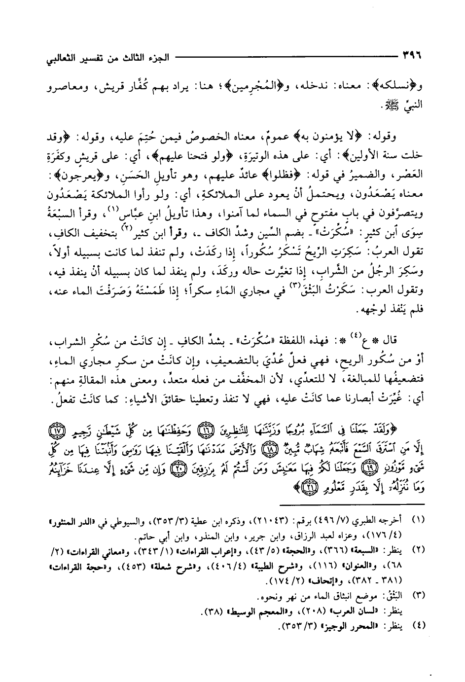 معناه يَصْعَدُون، ويحتملُ أنْ يعود على الملائكةِ، أي: ولو رأوا الملائكة يَصْعَدُون ويتصرَّفون في بابٍ مفتوحٍ في السماء لما آمنوا، وهذا تأويلُ ابنِ عبَّاسٍ «1» ، وقرأ السبْعَةُ سِوَى ابن كثيرٍ: «سُكِّرَتْ» - بضم السِّين وشدِّ الكاف-، وقرأ ابن كثير «2» بتخفيف الكافِ، تقول العربُ: سَكِرَتِ الرِّيحُ تَسْكَرُ سُكُوراً، إِذا ركَدَتْ، ولم تنفذ لما كانت بسبيله أولاً، وسَكِرَ الرجُلُ من الشَّرابِ، إِذا تغيَّرت حاله وركَدَ، ولم ينفذ لما كان بسبيله أنْ ينفذ فيه، وتقول العرب: سَكَرْتُ البَثْقَ «3» في مجاري المَاءِ سكراً إِذا طَمَسْتَهُ وَصَرَفْتَ الماء عنه، فلم يَنْفذ لوجْهه.
