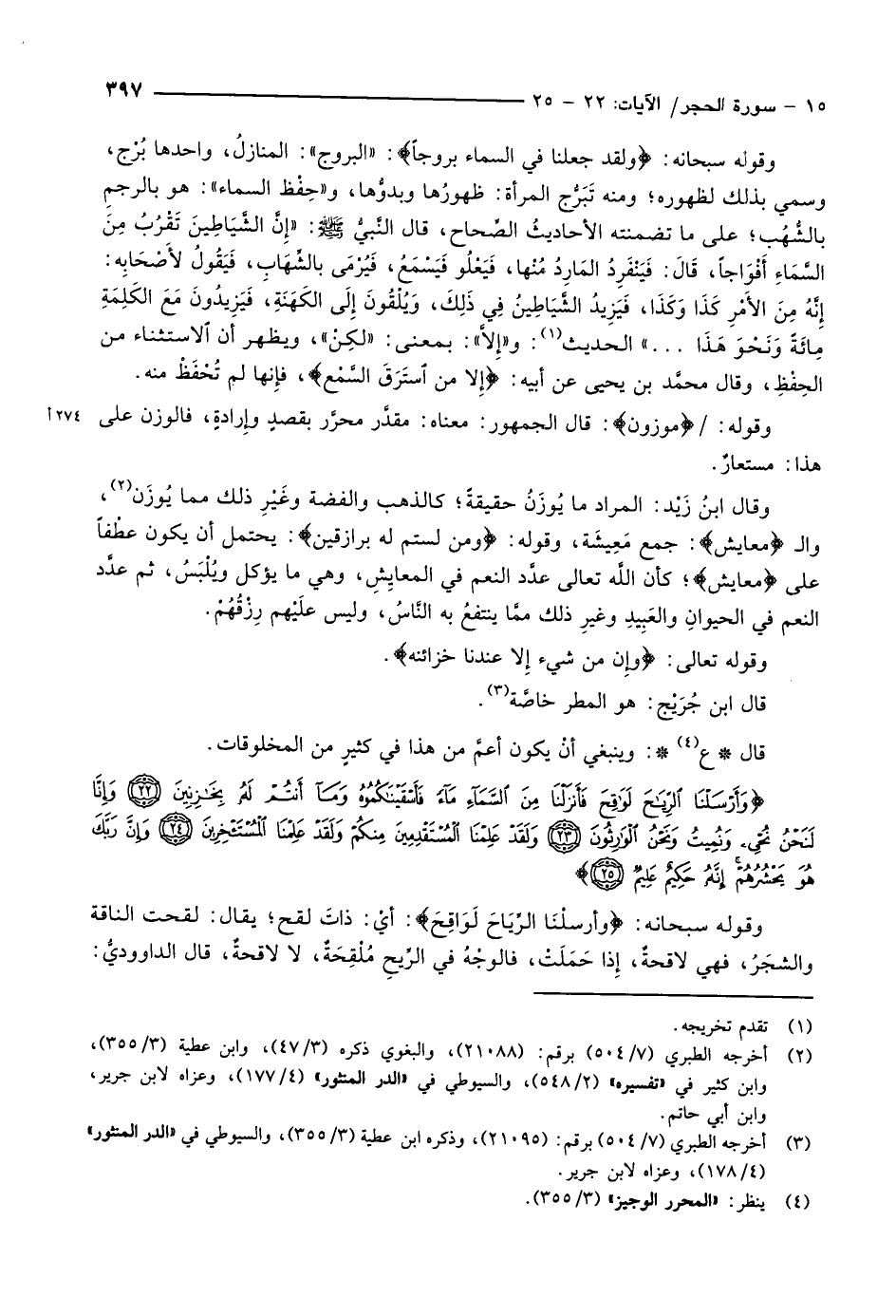وقوله سبحانه: وَلَقَدْ جَعَلْنا فِي السَّماءِ بُرُوجاً: «البروج» : المنازلُ، واحدها بُرْج، وسمي بذلك لظهوره ومنه تَبَرُّج المرأة: ظهورُها وبدوُّها، و «حِفْظ السماء» : هو بالرجمِ بالشُّهُب على ما تضمنته الأحاديث الصّحاح، قال النّبيّ صلّى الله عليه وسلّم: «إِنَّ الشَّيَاطِينَ تَقْرُبُ مِنَ السَّمَاءِ أَفْوَاجاً، قَالَ: فَيَنْفَرِدُ المَارِدُ مُنْها، فَيَعْلُو فَيَسْمَعُ، فَيُرْمَى بالشِّهَابِ، فَيَقُولُ لأَصْحَابِه: