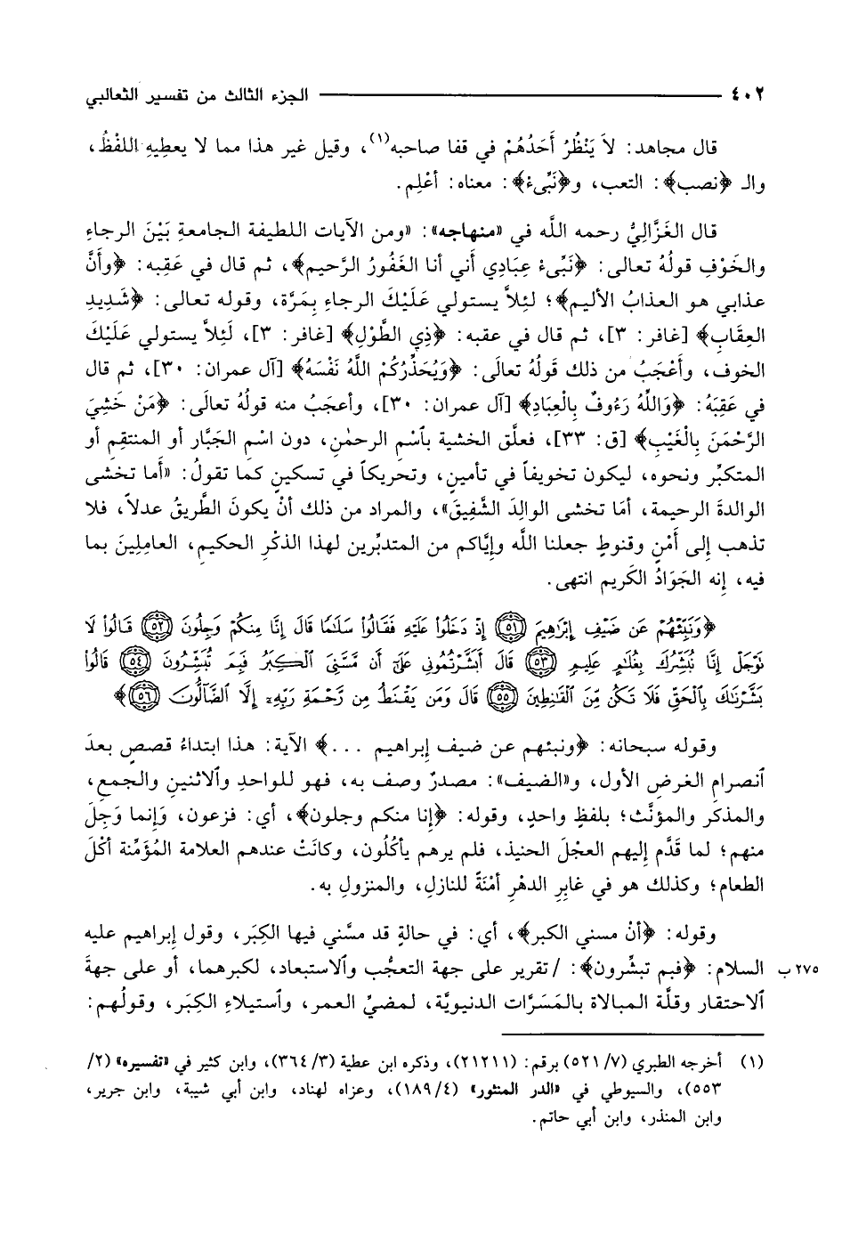 قال الغَزَّالِيُّ رحمه اللَّه في «منهاجه» : «ومن الآيات اللطيفة الجامعةِ بَيْنَ الرجاءِ والخَوْفِ قولُهُ تعالى: نَبِّئْ عِبادِي أَنِّي أَنَا الْغَفُورُ الرَّحِيمُ، ثم قال في عَقِبَهُ: وَأَنَّ عَذابِي هُوَ الْعَذابُ الْأَلِيمُ لئِلاَّ يستولي عَلَيْكَ الرجاءِ بِمَرَّة، وقوله تعالى: شَدِيدِ الْعِقابِ [غافر: 3] ، ثم قال في عقبه: ذِي الطَّوْلِ [غافر: 3] ، لَئِلاَّ يستولي عَلَيْكَ الخوف، وأَعْجَبُ من ذلك قَولُهُ تعالَى: وَيُحَذِّرُكُمُ اللَّهُ نَفْسَهُ [آل عمران: 30] ، ثم قال في عقبه: وَاللَّهُ رَؤُفٌ بِالْعِبادِ [آل عمران: 30] ، وأعجَبُ منه قولُهُ تعالَى: مَنْ خَشِيَ الرَّحْمنَ بِالْغَيْبِ [ق: 33] ، فعلَّق الخشية باسم الرحمن، دون اسْمِ الجَبَّار أو المنتقِمِ أو المتكبِّر ونحوه، ليكون تخويفاً في تأمينٍ، وتحريكاً في تسكينٍ كما تقولُ: «أَما تخشى الوالدةَ الرحيمة، أمَا تخشى الوالِدَ الشَّفِيقَ» ، والمراد من ذلك أنْ يكونَ الطَّريقُ عدلاً، فلا تذهب إِلى أَمْنٍ وقنوطٍ جعلنا اللَّه وإِيَّاكم من المتدبِّرين لهذا الذكْرِ الحكيمِ، العامِلِينَ بما فيه، إنه الجواد الكريم انتهى.