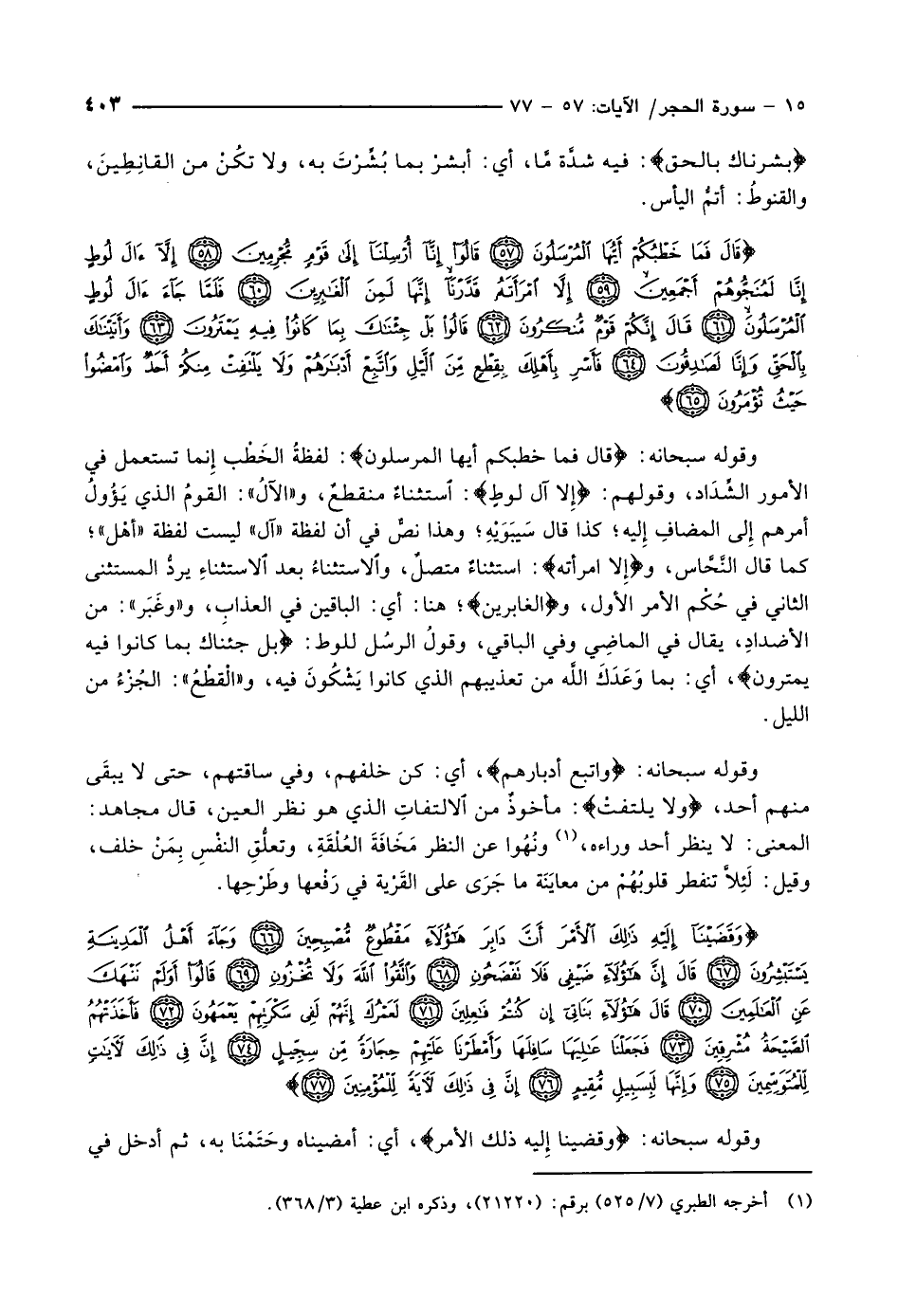 وقوله سبحانه: قالَ فَما خَطْبُكُمْ أَيُّهَا الْمُرْسَلُونَ: لفظةُ الخَطْب إِنما تستعمل في الأمور الشِّدَاد، وقولهم: إِلَّا آلَ لُوطٍ: استثناء منقطعٌ، و «الآلُ» : القومُ الذي يَؤولُ أمرهم إِلى المضافِ إليه كذا قال سيبويه وهذا نصّ في أن لفظة «آل» ليست لفظة «أهْل» كما قال النّحّاس، وإِلَّا امْرَأَتَهُ: استثناءٌ متصلٌ، والاستثناء بعد الاستثناء يردُّ المستثنى الثاني في حكم الأمر الأول، والْغابِرِينَ هنا: أي: الباقين في العذابِ، و «وغَبَر» : من الأضدادِ، يقال في الماضِي وفي الباقي، وقولُ الرسُل للوط: بَلْ جِئْناكَ بِما كانُوا فِيهِ يَمْتَرُونَ، أي: بما وَعَدَكَ اللَّه من تعذيبهم الذي كانوا يَشْكُونَ فيه، و «الْقَطْعُ» : الجُزْءُ من الليل.