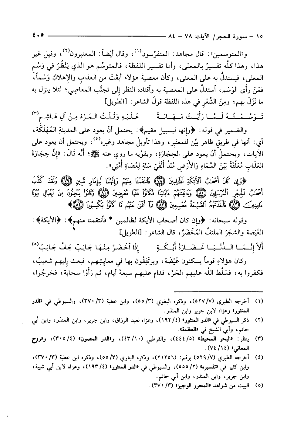 والضمير في قوله: وَإِنَّها لَبِسَبِيلٍ مُقِيمٍ: يحتمل أنْ يعود على المدينةِ المُهْلَكَة، أي: أنها في طريقٍ ظاهر بيِّن للمعتَبِر، وهذا تأويلُ مجاهد وغيره «4» ، ويحتمل أن يعود على الآيات، ويحتملُ أنْ يعود على الحِجَارَةِ، ويقوِّيه ما روي عنه صلّى الله عليه وسلّم أَنَّه قَالَ: «إِنَّ حِجَارَةَ العَذَابِ مُعَلَّقَةٌ بَيْنَ السَّمَاءِ وَالأَرْضِ مُنْذُ أَلْفَيْ سَنَةٍ لِعُصَاةِ أُمَّتِي» .