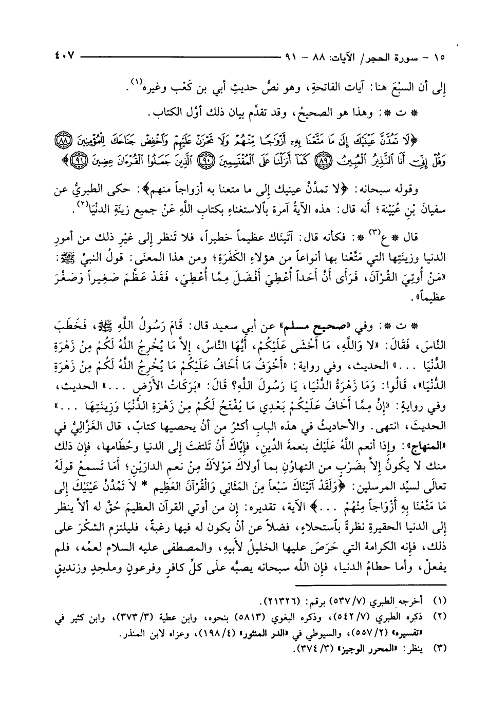 وقوله سبحانه: لاَ تَمُدَّنَّ عَيْنَيْكَ إِلى مَا مَتَّعْنا بِهِ أَزْواجاً مِنْهُمْ: حكى الطبريُّ عن سفيانَ بْنِ عُيَيْنة أَنه قال: هذه الآيةُ آمرة بالاستغناء بكتابِ اللَّهِ عَنْ جميع زينَةِ الدنْيَا «2» .