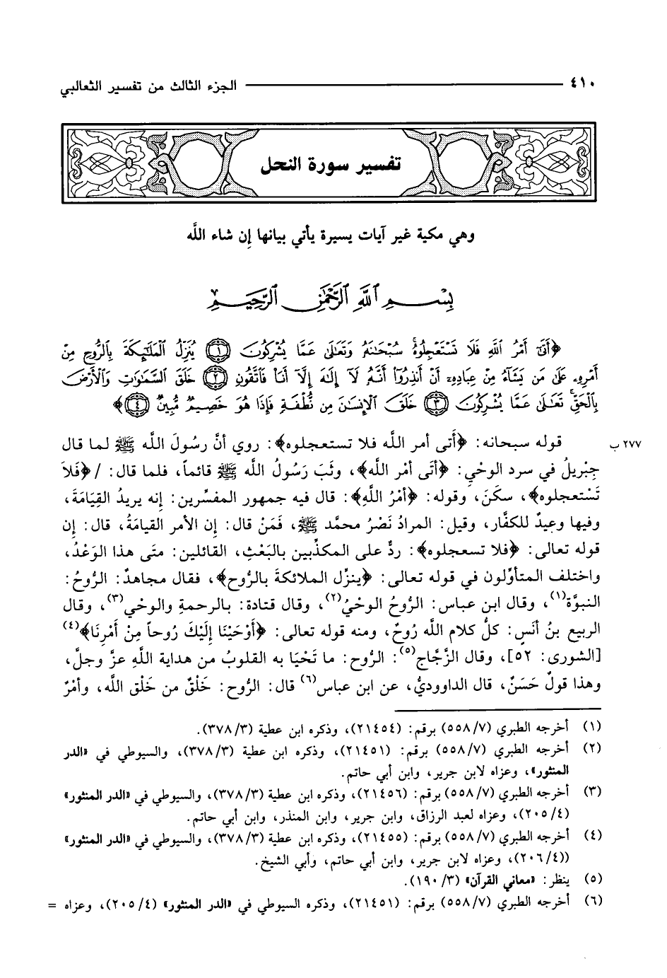 قوله سبحانه: أَتى أَمْرُ اللَّهِ فَلا تَسْتَعْجِلُوهُ: روي أنّ رسول الله صلّى الله عليه وسلّم لما قال جِبْريلُ في سرد الوحْيِ: أَتى أَمْرُ اللَّهِ، وثب رسول الله صلّى الله عليه وسلّم قائماً، فلما قال: / فَلا تَسْتَعْجِلُوهُ، سكَنَ، وقوله: أَمْرُ اللَّهِ: قال فيه جمهور المفسِّرين: إِنه يريدُ القِيَامَةَ، وفيها وعيدٌ للكفَّار، وقيل: المرادُ نصر محمّد صلّى الله عليه وسلّم، فَمَنْ قال: إِن الأمر القيامَةُ، قال: إِن قوله تعالى: فَلا تَسْتَعْجِلُوهُ: ردٌّ على المكذِّبين بالبَعْثِ، القائلين: متَى هذا الوَعْدُ، واختلف المتأوِّلون في قوله تعالى: يُنَزِّلُ الْمَلائِكَةَ بِالرُّوحِ، فقال مجاهد: الرّوح: