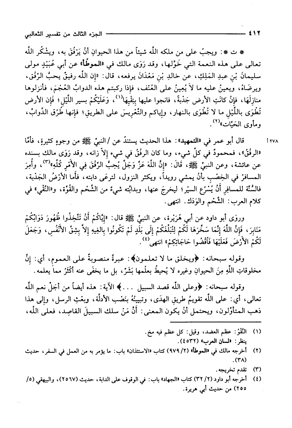 ت: ويجبُ على من مَلَّكَهُ اللَّه شيئاً من هذا الحيوانِ أنْ يَرْفُقَ به، ويشْكُر اللَّه تعالى على هذه النعمة التي خَوَّلها، وقد رَوَى مالك في «الموطَّأ» عن أبي عُبَيْدٍ مولى سليمانَ بْنِ عبدِ المَلِكِ، عن خالدِ بْنِ مَعْدَانَ يرفعه، قال: «إِن اللَّه رفيقٌ يحبُّ الرِّفْق، ويرضَاهُ، ويعينُ عليه ما لاَ يُعِينُ على العُنْف، فإِذا ركبتم هذه الدوابَّ العُجْمَ، فأنزلوها منازِلَهَا، فإِنْ كانَتِ الأرض جَدْبةً، فانجوا عليها بِنِقْيِهَا «1» ، وَعَلَيْكُمْ بسير اللَّيْلِ فَإِن الأرض تُطْوَى باللَّيْلِ ما لا تُطْوَى بالنهار، وإِياكم والتَّعْرِيسَ على الطريقِ فإِنها طُرُق الدَّوابِّ، ومأوى الحَيَّات» «2» .