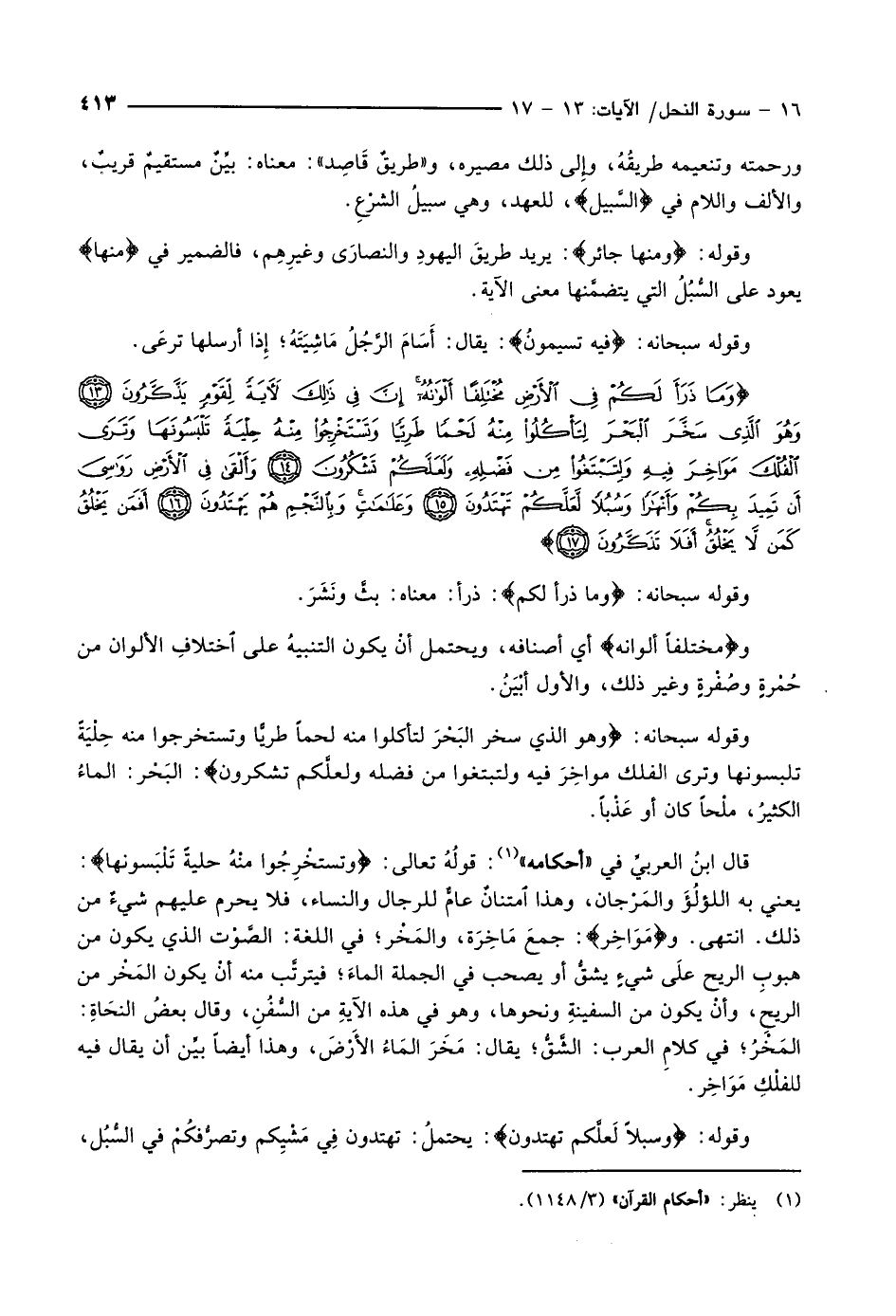 وَما ذَرَأَ لَكُمْ فِي الْأَرْضِ مُخْتَلِفاً أَلْوانُهُ إِنَّ فِي ذلِكَ لَآيَةً لِقَوْمٍ يَذَّكَّرُونَ (13) وَهُوَ الَّذِي سَخَّرَ الْبَحْرَ لِتَأْكُلُوا مِنْهُ لَحْماً طَرِيًّا وَتَسْتَخْرِجُوا مِنْهُ حِلْيَةً تَلْبَسُونَها وَتَرَى الْفُلْكَ مَواخِرَ فِيهِ وَلِتَبْتَغُوا مِنْ فَضْلِهِ وَلَعَلَّكُمْ تَشْكُرُونَ (14) وَأَلْقى فِي الْأَرْضِ رَواسِيَ أَنْ تَمِيدَ بِكُمْ وَأَنْهاراً وَسُبُلاً لَعَلَّكُمْ تَهْتَدُونَ (15) وَعَلاماتٍ وَبِالنَّجْمِ هُمْ يَهْتَدُونَ (16) أَفَمَنْ يَخْلُقُ كَمَنْ لا يَخْلُقُ أَفَلا تَذَكَّرُونَ (17)