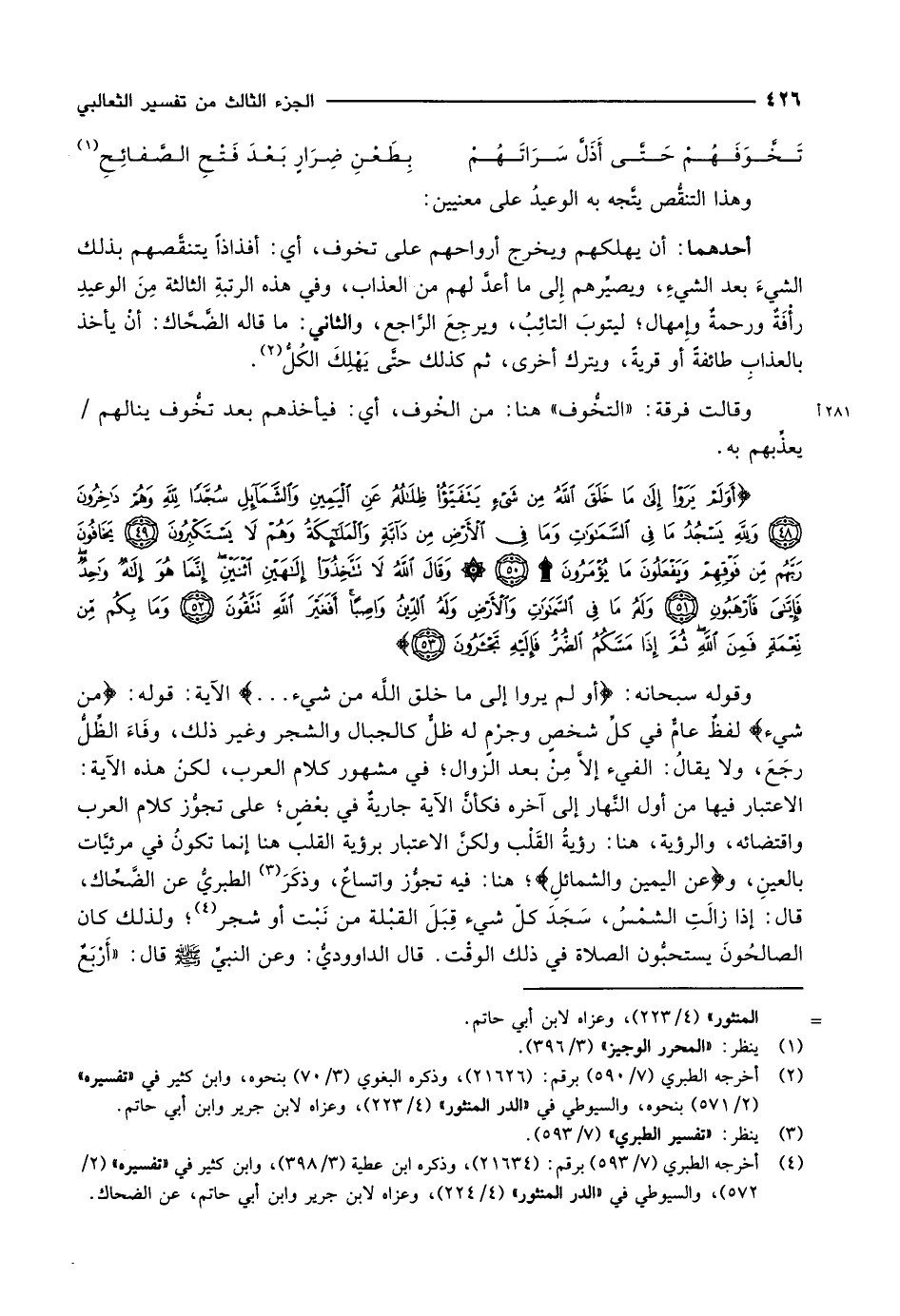 وقوله سبحانه: أَوَلَمْ يَرَوْا إِلى مَا خَلَقَ اللَّهُ مِنْ شَيْءٍ ... الآية: قوله: مِنْ شَيْءٍ لفظٌ عامٌّ في كلِّ شخصٍ وجرْمٍ له ظلٌّ كالجبال والشجر وغير ذلك، وفَاءَ الظِّلُّ رجَعَ، ولا يقالُ: الفيء إلاَّ مِنْ بعد الزوال في مشهور كلام العرب، لكنْ هذه الآية: