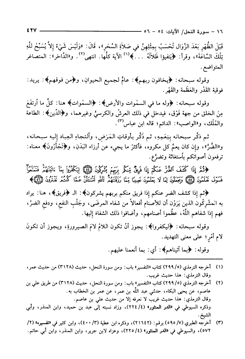 (1) أخرجه الترمذي (5/ 299) كتاب «التفسير» باب: ومن سورة النحل، حديث (3128) من حديث عمر، وقال الترمذي: هذا حديث غريب.