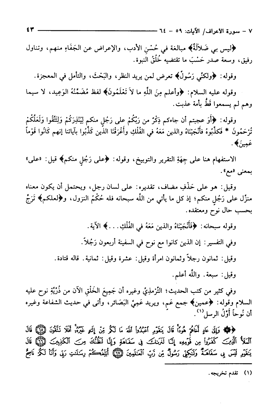 وفي كثير من كتب الحديث التِّرْمذِيِّ وغيره أن جَمِيعَ الخَلْقِ الآن من ذُرِّيَّةِ نوح عليه السلام وقوله: عَمِينَ جمع عَمٍ، ويريد عَمِيَّ البَصَائر، وأتى في حديث الشفاعة وغيره أن نُوحاً أَوَّلُ الرسل «1» .