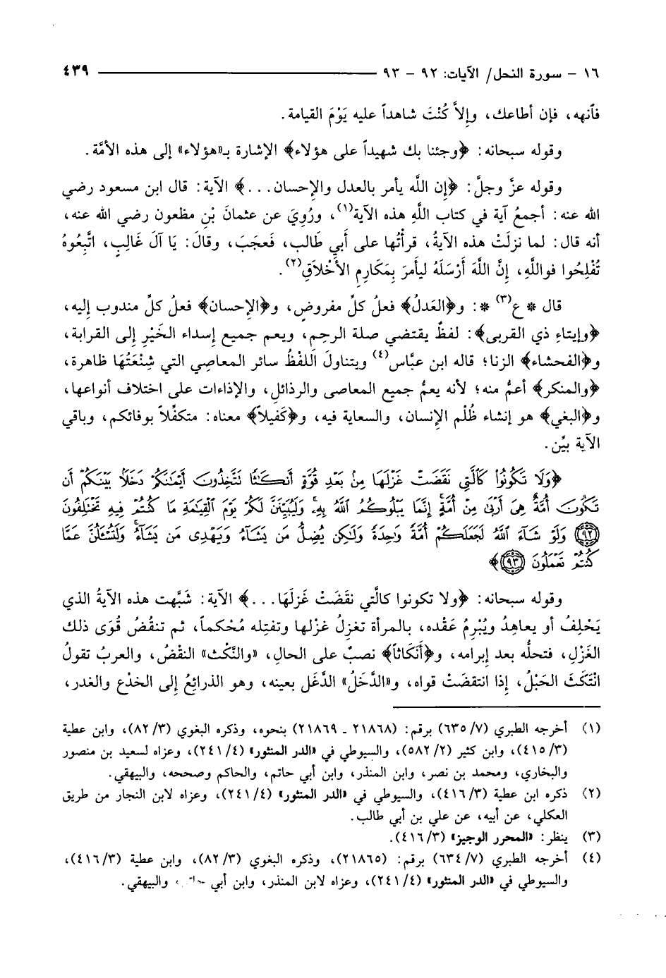 قال ع «3» : والعدل فعل كلّ مفروض، والْإِحْسانِ فعل كلّ مندوب إليه، وَإِيتاءِ ذِي الْقُرْبى: لفظُ يقتضي صلة الرحِمِ، ويعم جميع إسداء الخير إلى القرابة، والْفَحْشاءِ الزنا قاله ابن عبَّاس «4» ويتناولَ اللفْظُ سائر المعاصِي التي شِنْعَتُهَا ظاهرة، وَالْمُنْكَرِ أعمُّ منه لأنه يعمُّ جميع المعاصى والرذائلِ، والإذاءات على اختلاف أنواعها، والْبَغْيِ هو إنشاء ظُلْم الإِنسان، والسعاية فيه، وكَفِيلًا معناه: متكفّلا بوفائكم، وباقي الآية بيّن.