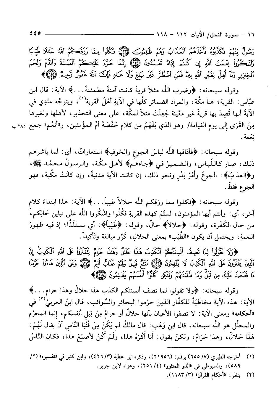 وَلا تَقُولُوا لِما تَصِفُ أَلْسِنَتُكُمُ الْكَذِبَ هذا حَلالٌ وَهذا حَرامٌ لِتَفْتَرُوا عَلَى اللَّهِ الْكَذِبَ إِنَّ الَّذِينَ يَفْتَرُونَ عَلَى اللَّهِ الْكَذِبَ لا يُفْلِحُونَ (116) مَتاعٌ قَلِيلٌ وَلَهُمْ عَذابٌ أَلِيمٌ (117) وَعَلَى الَّذِينَ هادُوا حَرَّمْنا ما قَصَصْنا عَلَيْكَ مِنْ قَبْلُ وَما ظَلَمْناهُمْ وَلكِنْ كانُوا أَنْفُسَهُمْ يَظْلِمُونَ (118)