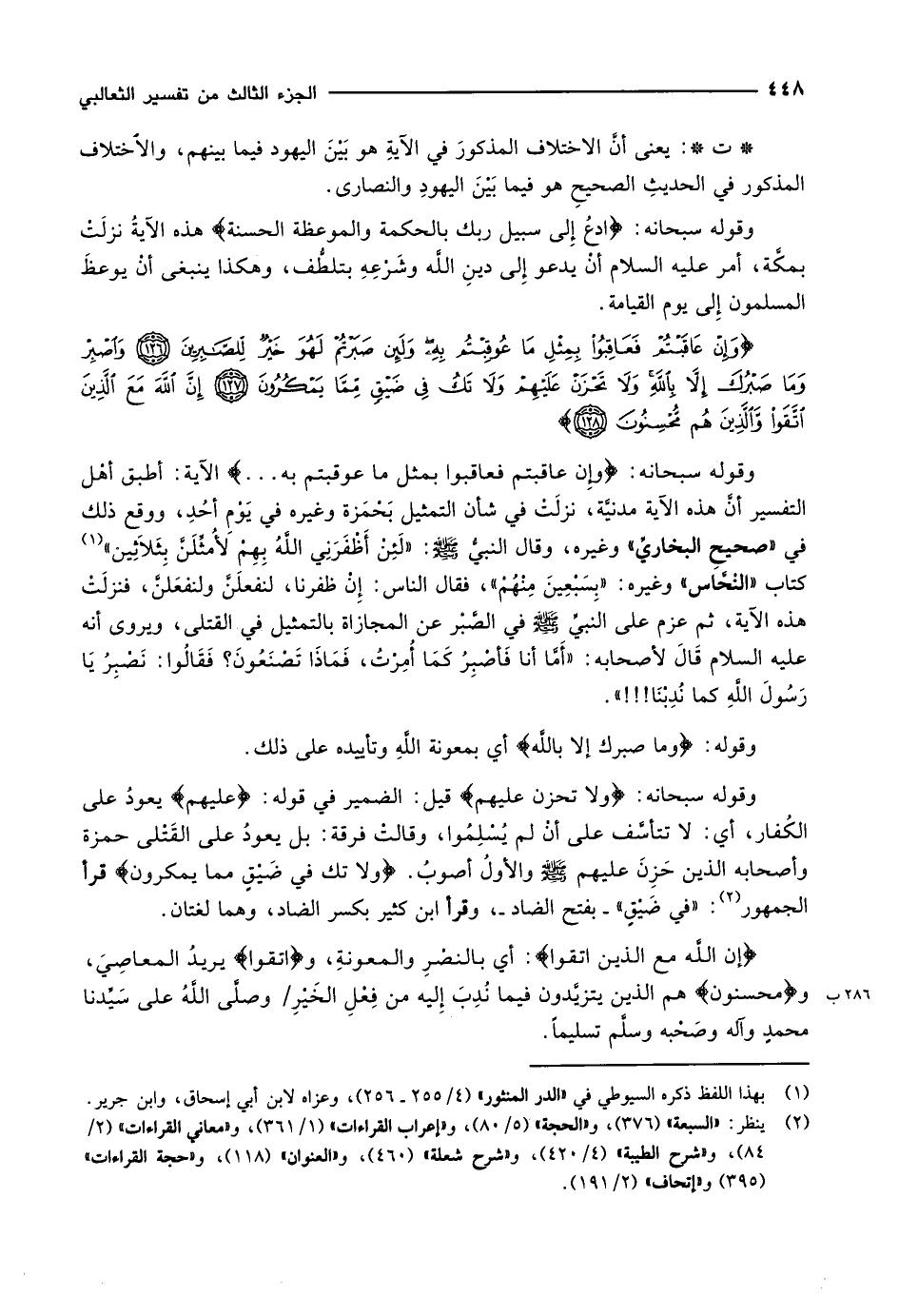 وَإِنْ عاقَبْتُمْ فَعاقِبُوا بِمِثْلِ مَا عُوقِبْتُمْ بِهِ وَلَئِنْ صَبَرْتُمْ لَهُوَ خَيْرٌ لِلصَّابِرِينَ (126) وَاصْبِرْ وَما صَبْرُكَ إِلاَّ بِاللَّهِ وَلا تَحْزَنْ عَلَيْهِمْ وَلا تَكُ فِي ضَيْقٍ مِمَّا يَمْكُرُونَ (127) إِنَّ اللَّهَ مَعَ الَّذِينَ اتَّقَوْا وَالَّذِينَ هُمْ مُحْسِنُونَ (128)
