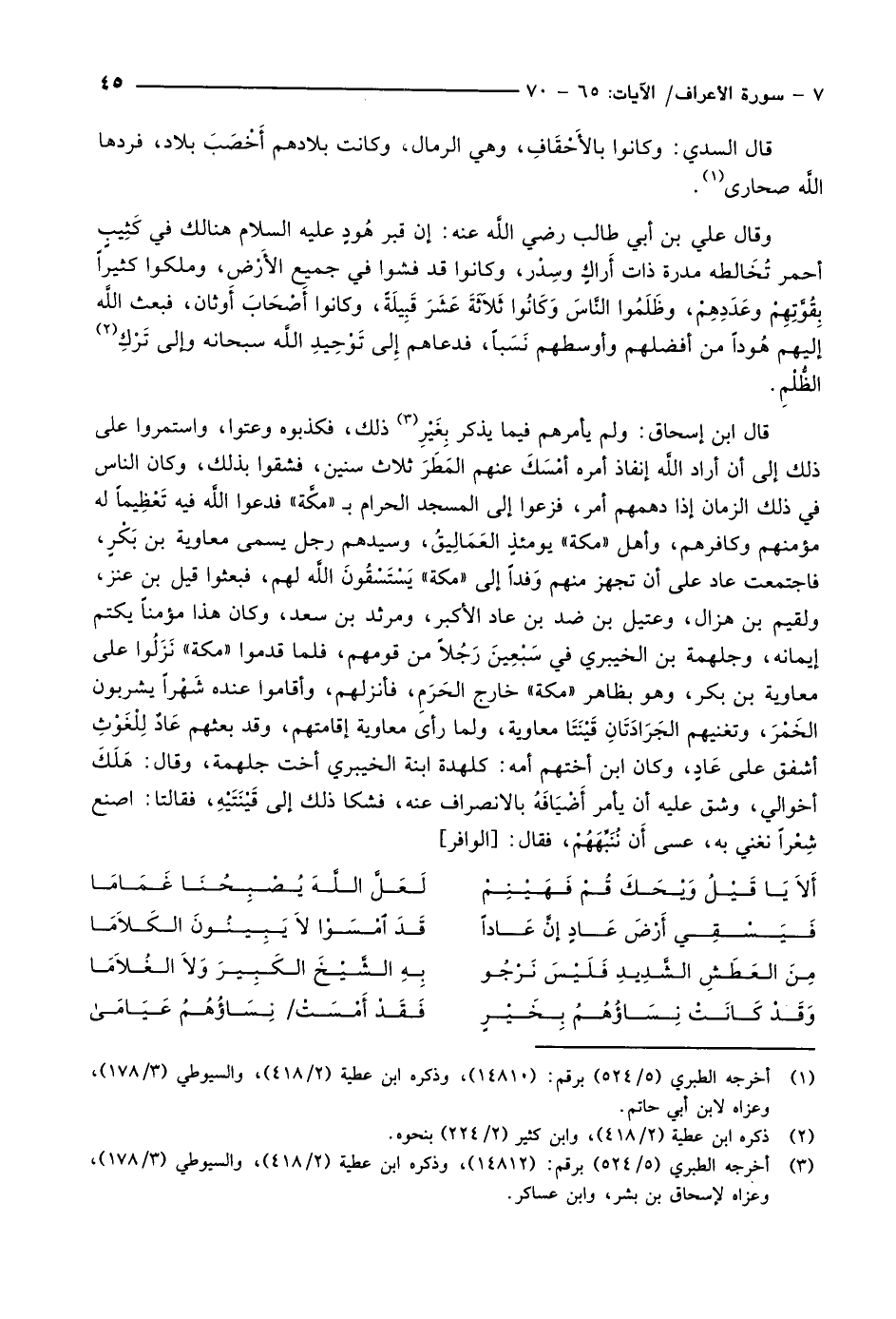 وقال علي بن أبي طالب رضي الله عنه: إن قبر هُودٍ عليه السلام هنالك في كَثِيبٍ أحمر تُخَالطه مدرة ذات أَراكٍ وسِدْر، وكانوا قد فشوا في جميع الأَرْض، وملكوا كثيراً بِقُوَّتِهِمْ وعَدَدِهِمْ، وظَلَمُوا النَّاسَ وَكَانُوا ثَلاَثَةَ عَشَرَ قَبِيلَةً، وكانوا أَصْحَابَ أَوثان، فبعث اللَّه إليهم هُوداً من أفضلهم وأوسطهم نَسَباً، فدعاهم إِلى تَوْحِيدِ اللَّه سبحانه وإلى تَرْكِ «2» الظُّلْمِ.