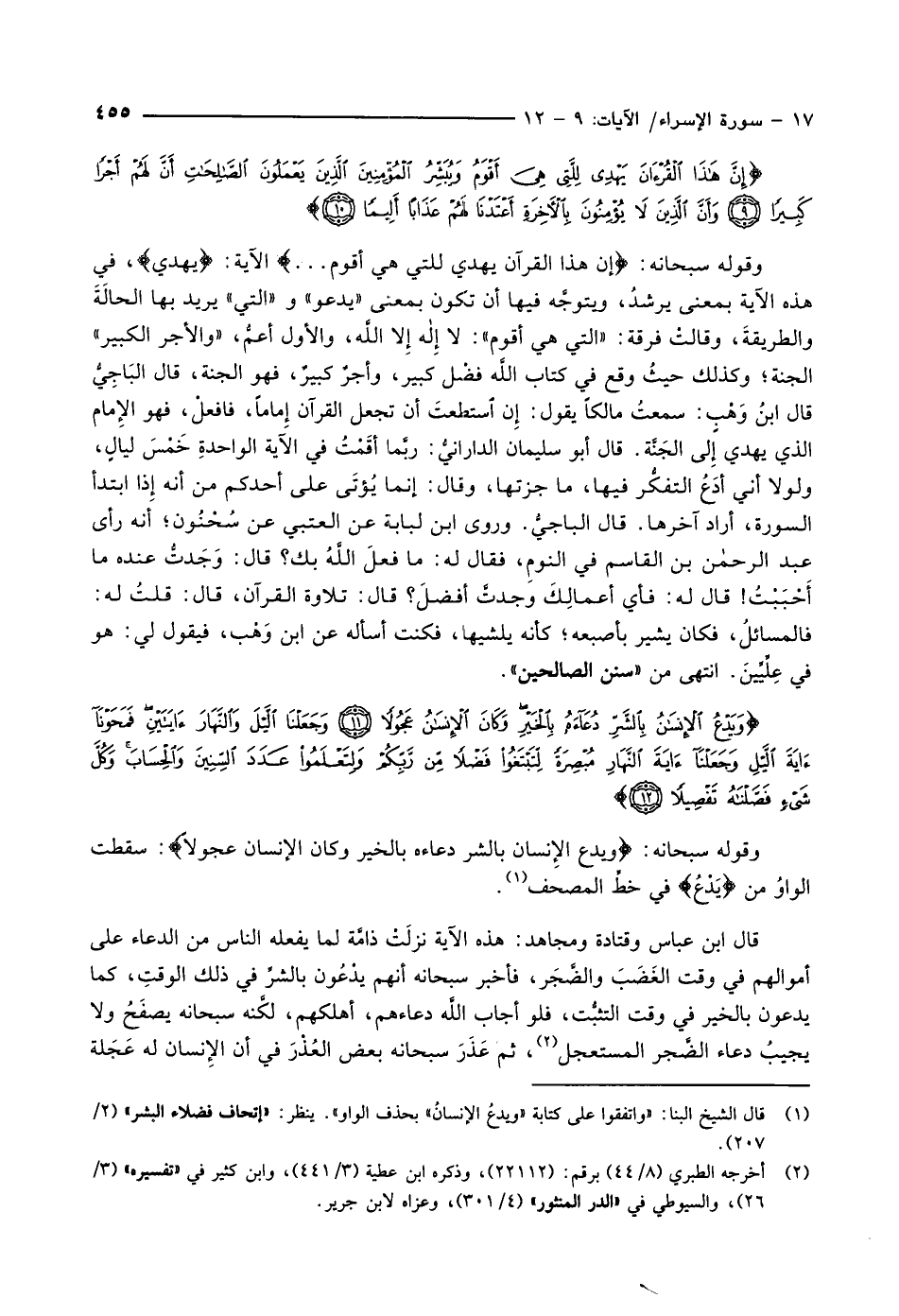 وقوله سبحانه: إِنَّ هذَا الْقُرْآنَ يَهْدِي لِلَّتِي هِيَ أَقْوَمُ ... الآية: يَهْدِي، في هذه الآية بمعنى يرشدُ، ويتوجَّه فيها أن تكون بمعنى «يدعو» و «التي» يريد بها الحالَةَ والطريقةَ، وقالتْ فرقة: «التي هي أقوم» : لا إله إِلا اللَّه، والأول أعمُّ، «والأجر الكبير» الجنة وكذلك حيثُ وقع في كتاب اللَّه فضْلُ كبير، وأجرٌ كبيرٌ، فهو الجنة، قال البَاجِيُّ قال ابنُ وَهْبٍ: سمعتُ مالكاً يقول: إِن استطعت أن تجعل القرآن إِماماً، فافعلْ، فهو الإِمام الذي يهدي إِلى الجَنَّة. قال أبو سليمان الدارانيُّ: ربَّما أقَمْتُ في الآية الواحدةِ خَمْسَ ليالٍ، ولولا أني أدَعُ التفكُّر فيها، ما جزتها، وقال: إنما يُؤتَى على أحدكم من أنه إِذا ابتدأ السورة، أراد آخرها. قال الباجيُّ. وروى ابن لبابة عن العتبي عن سُحْنُون أنه رأى عبد الرحمن بن القاسم في النومِ، فقال له: ما فعلَ اللَّهُ بك؟ قال: وَجَدتُّ عنده ما أَحْبَبْتُ! قال له: فأي أعمالِكَ وجدتَّ أفضلَ؟ قال: تلاوة القرآن، قال: قلتُ له: