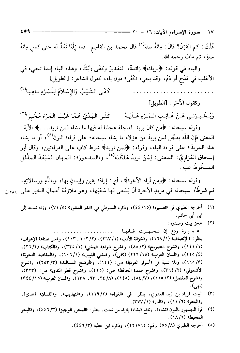 المعنى فإِن اللَّه يعجِّل لمن يريدُ من هؤلاء ما يشاء سبحانه على قراءة النون «4» ، أو ما يشاء هذا المريد على قراءة الياء، وقوله: لِمَنْ نُرِيدُ شرط كافٍ على القراءتين، وقال أبو إسحاق الفَزَارِيُّ: المعني: لِمَنْ نريدُ هَلَكَتَه «5» ، و «المدحورُ» : المهان المُبْعَدُ المذَّلل المسخُوطُ عليه.