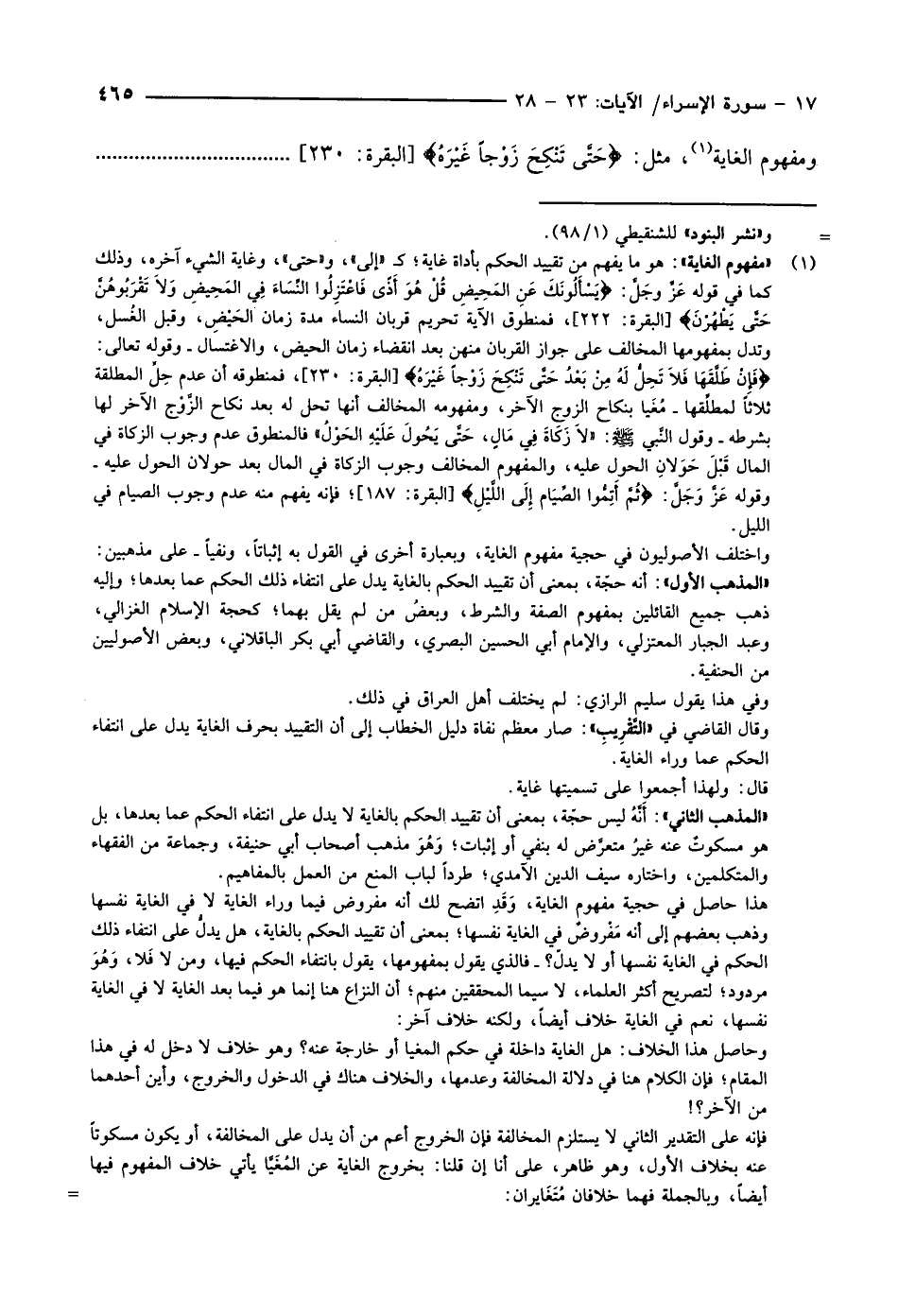 هذا حاصل في حجية مفهوم الغاية، وقد اتضح لك أنه مفروض فيما وراء الغاية لا في الغاية نفسها وذهب بعضهم إلى أنه مفروض في الغاية نفسها بمعنى أن تقييد الحكم بالغاية، هل يدلّ على انتفاء ذلك الحكم في الغاية نفسها أو لا يدلّ؟ - فالذي يقول بمفهومها، يقول بانتفاء الحكم فيها، ومن لا فلا، وهو مردود لتصريح أكثر العلماء، لا سيما المحققين منهم أن النزاع هنا إنما هو فيما بعد الغاية لا في الغاية نفسها، نعم في الغاية خلاف أيضا، ولكنه خلاف آخر: