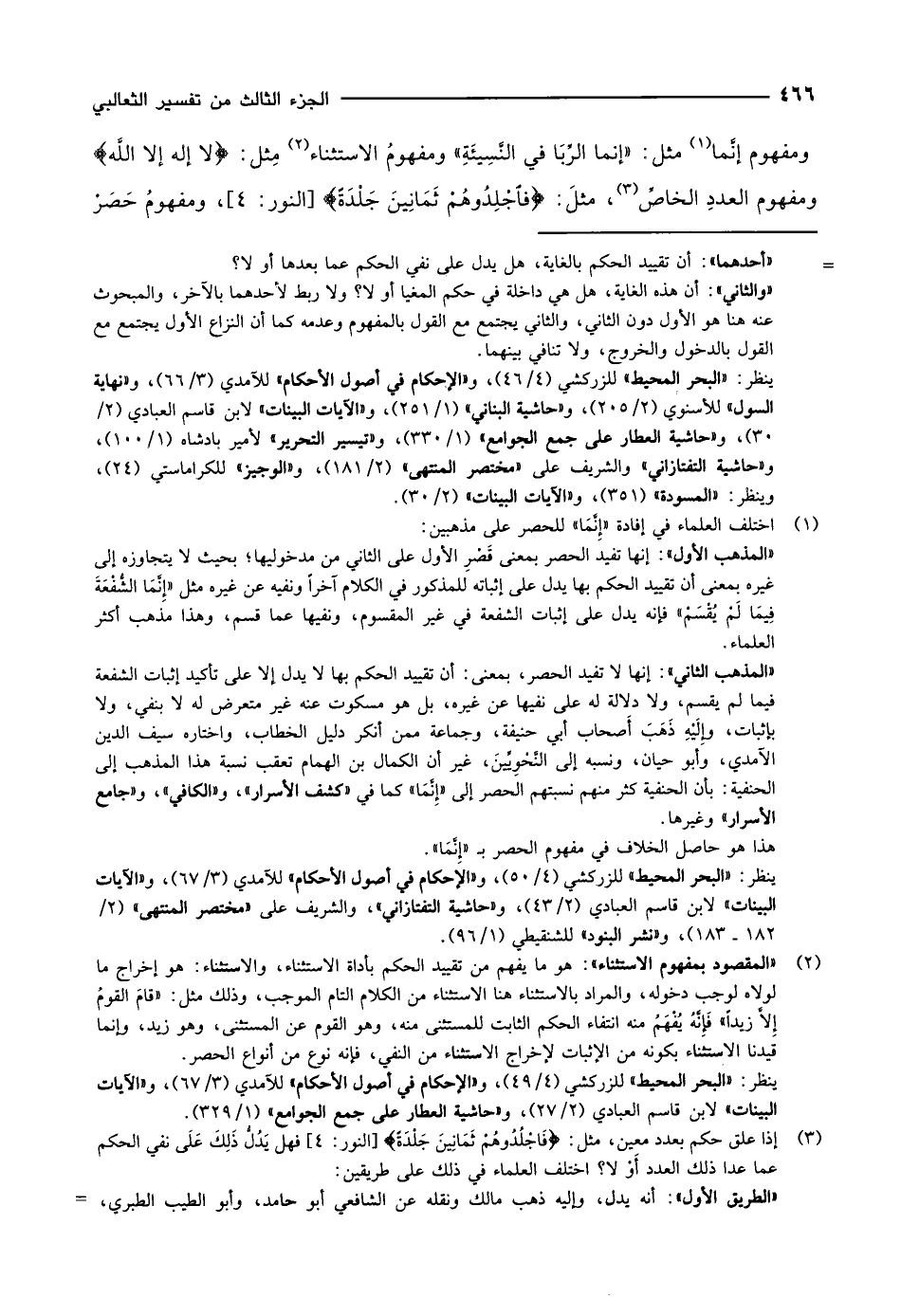 ومفهوم إنَّما «1» مثل: «إنما الرِّبَا في النَّسِيئَةِ» ومفهومُ الاستثناء «2» مِثل: لا إله إلا الله ومفهوم العددِ الخاصِّ «3» ، مثلَ: فَاجْلِدُوهُمْ ثَمانِينَ جَلْدَةً [النور: 4] ، ومفهوم حصر
