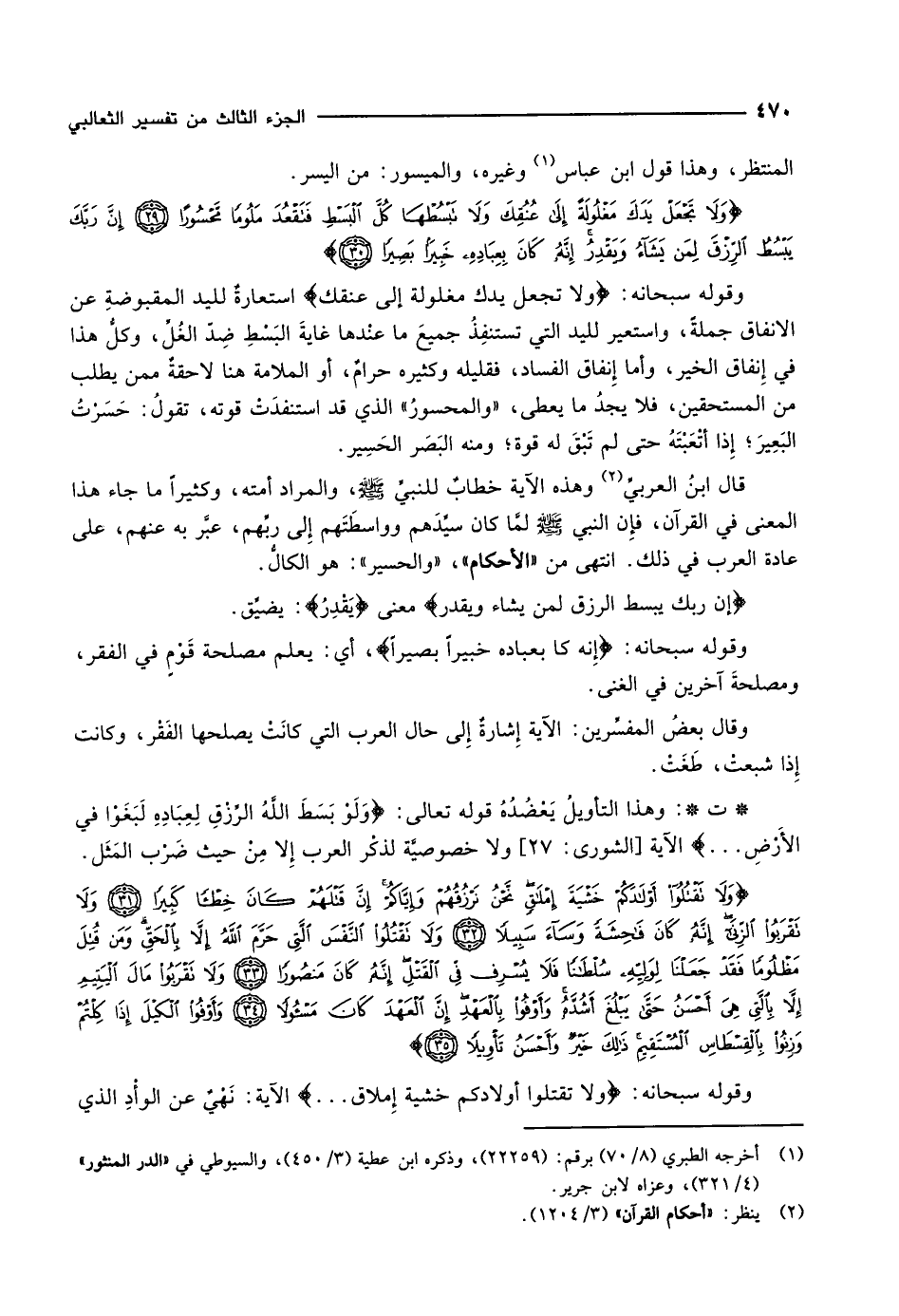 وقوله سبحانه: وَلا تَجْعَلْ يَدَكَ مَغْلُولَةً إِلى عُنُقِكَ استعارةٌ لليد المقبوضةِ عن الانفاق جملةً، واستعير لليد التي تستنفِذُ جميعَ ما عنْدها غايةَ البَسْطِ ضِدّ الغُلِّ، وكلُّ هذا في إِنفاق الخير، وأما إِنفاق الفساد، فقليله وكثيره حرامٌ، أو الملامة هنا لاحقةٌ ممن يطلب من المستحقين، فلا يجدُ ما يعطى، «والمحسورُ» الذي قد استنفدَتْ قوته، تقولُ: حَسَرْتُ البَعِيرَ إِذا أتْعَبْتَهُ حتى لم تَبْقَ له قوة ومنه البَصَرِ الحَسِير.