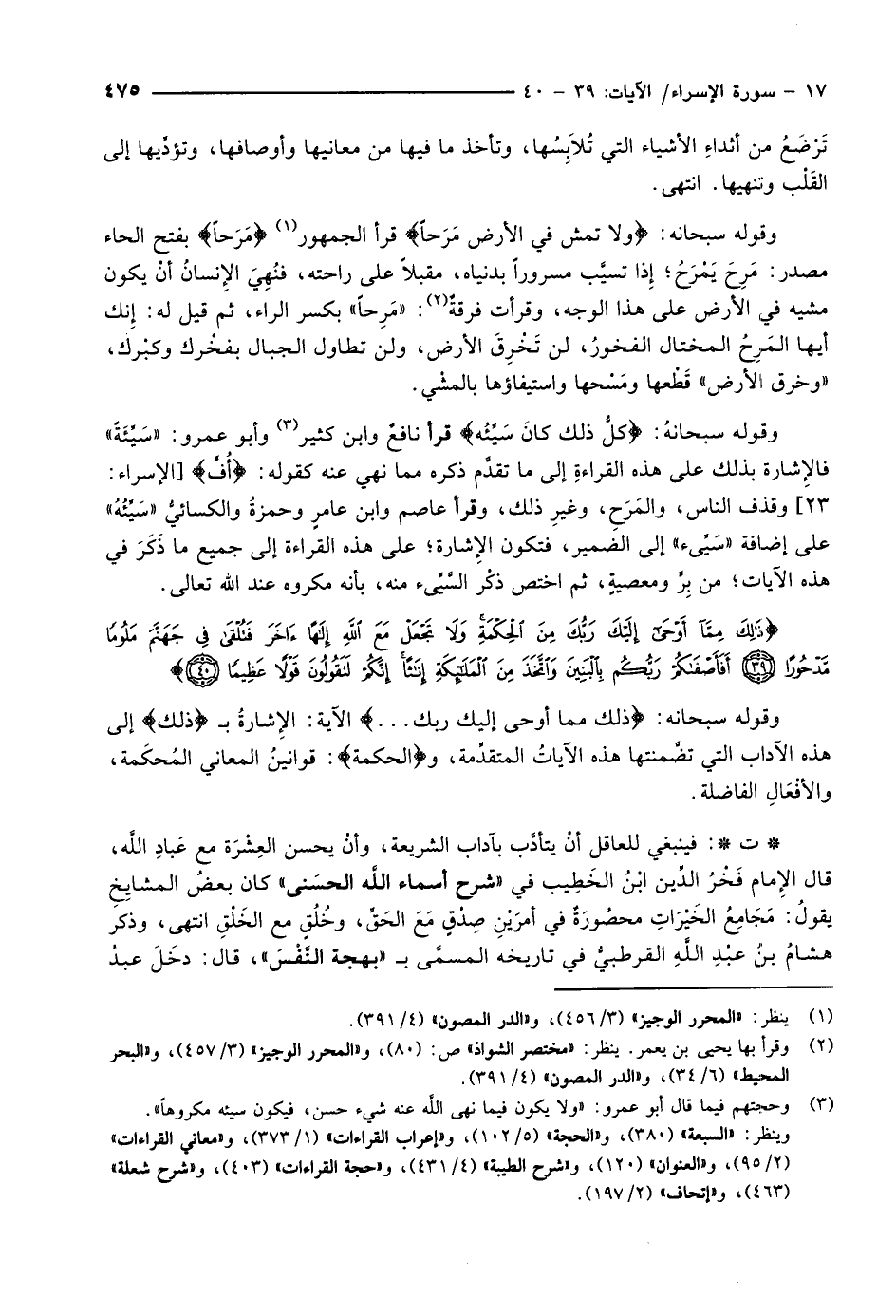 23] وقذف الناس، والمَرَحِ، وغيرِ ذلك، وقرأ عاصم وابن عامرٍ وحمزةُ والكسائيُّ «سَيِّئُهُ» على إضافة «سَيِّىء» إلى الضمير، فتكون الإِشارة على هذه القراءة إلى جميع ما ذَكَرَ في هذه الآيات من برّ ومعصية، ثم اختص ذكر السّيّئ منه، بأنه مكروه عند الله تعالى.