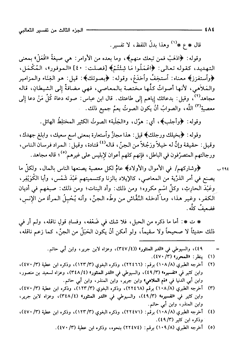 وقوله: بِخَيْلِكَ وَرَجِلِكَ قيل: هذا مجازٌ واستعارة بمعنى اسع سعيك، وابلغ جهدك، وقيل: حقيقة وإنَّ له خيلاً ورَجُلاً من الجنِّ، قاله «4» قتادة، وقيل: المراد فرسان الناس، ورجالتهم المتصرِّفون في الباطل، فإِنهم كلهم أعوان لإِبليس على غيرهم «5» قاله مجاهد.