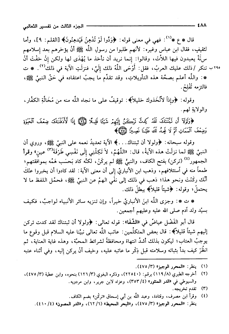 قال أبو الفَضْل عياضٌ في «الشِّفَا» : قوله تعالى: وَلَوْلا أَنْ ثَبَّتْناكَ لَقَدْ كِدْتَ تَرْكَنُ إِلَيْهِمْ شَيْئاً قَلِيلًا: قال بعض المتكلِّمين: عاتب اللَّه تعالى نبيَّنا عليه السلام قبل وقوع ما يوجبُ العتاب ليكون بذلك أشدَّ انتهاءً ومحافظةً لشرائط المحبَّة، وهذه غاية العناية، ثم انظُرْ كيف بدأ بثباته وسلامته قبل ذِكْر ما عاتبه عليه، وخيف أنْ يركن إليه، وفي أثناء عتبه
