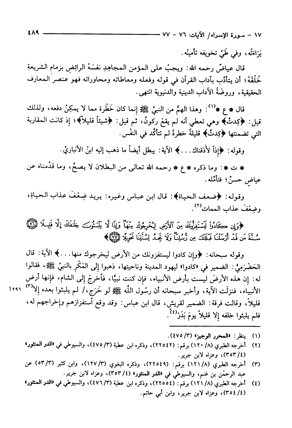 وقوله سبحانه: وَإِنْ كادُوا لَيَسْتَفِزُّونَكَ مِنَ الْأَرْضِ لِيُخْرِجُوكَ مِنْها ... الآية: قال الحَضْرَمِيُّ: الضمير في «كادوا» ليهود المدينة وناحيتها، ذهبوا إِلى المَكْرِ بالنبيّ صلّى الله عليه وسلّم، فقالوا له: إِن هذه الأرضَ ليست بأرض الأنبياء، فإِن كنت نبيًّا، فاخرج إِلى الشام، فإِنها أرض الأنبياء، فنزلَت الآية، وأخبر سبحانه أن رسول الله صلّى الله عليه وسلّم لو خَرَج، / لم يلبثوا بعده إِلا «3» قليلاً، وقالت فرقة: الضمير لقريشٍ، قال ابن عباس: وقد وقع استفزازهم وإِخراجهم له، فلم يلبثوا خلفه إلا قليلا يوم بدر «4» .