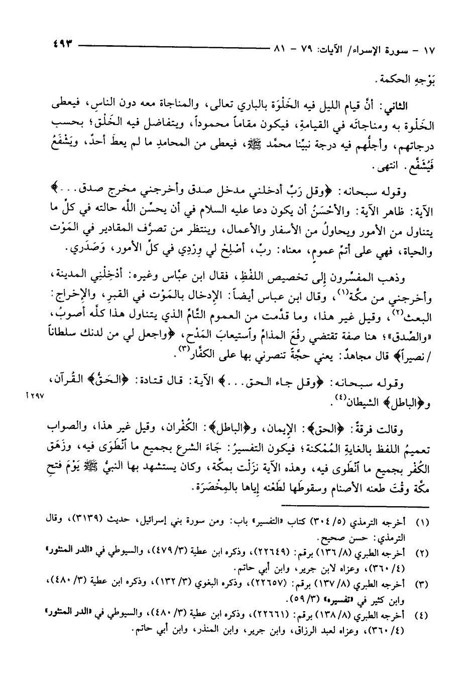 (1) أخرجه الترمذي (5/ 304) كتاب «التفسير» باب: ومن سورة بني إسرائيل، حديث (3139) ، وقال الترمذي: حسن صحيح.