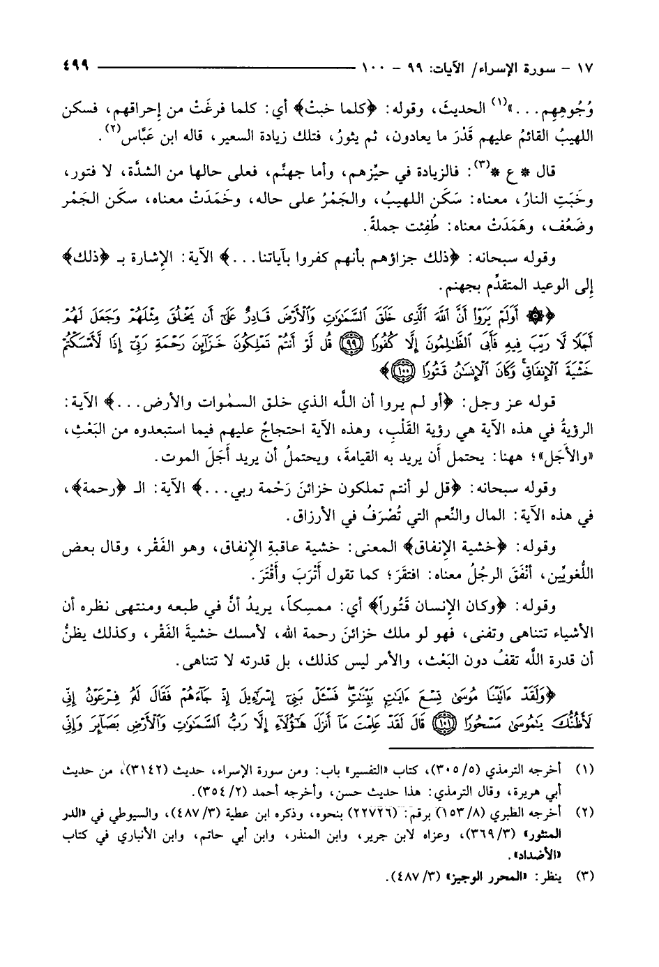 أَوَلَمْ يَرَوْا أَنَّ اللَّهَ الَّذِي خَلَقَ السَّماواتِ وَالْأَرْضَ قادِرٌ عَلى أَنْ يَخْلُقَ مِثْلَهُمْ وَجَعَلَ لَهُمْ أَجَلاً لا رَيْبَ فِيهِ فَأَبَى الظَّالِمُونَ إِلاَّ كُفُوراً (99) قُلْ لَوْ أَنْتُمْ تَمْلِكُونَ خَزائِنَ رَحْمَةِ رَبِّي إِذاً لَأَمْسَكْتُمْ خَشْيَةَ الْإِنْفاقِ وَكانَ الْإِنْسانُ قَتُوراً (100)