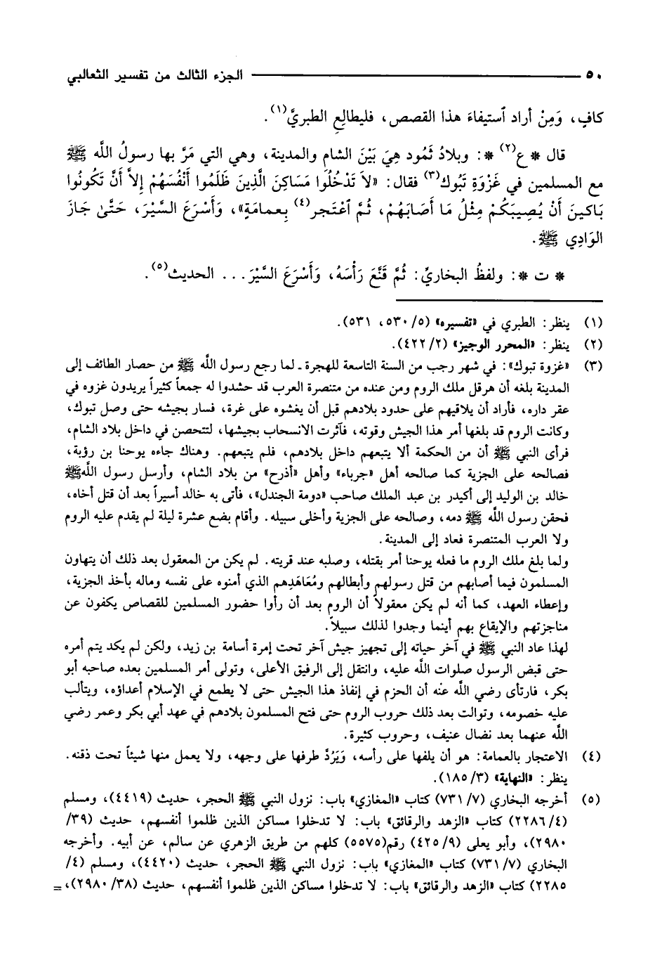 (5) أخرجه البخاري (7/ 731) كتاب «المغازي» باب: نزول النبي صلّى الله عليه وسلّم الحجر، حديث (4419) ، ومسلم (4/ 2286) كتاب «الزهد والرقائق» باب: لا تدخلوا مساكن الذين ظلموا أنفسهم، حديث (39/ 2980) ، وأبو يعلى (9/ 425) رقم (5575) كلهم من طريق الزهري عن سالم، عن أبيه. وأخرجه البخاري (7/ 731) كتاب «المغازي» باب: نزول النبي صلّى الله عليه وسلّم الحجر، حديث (4420) ، ومسلم (4/ 2285) كتاب «الزهد والرقائق» باب: لا تدخلوا مساكن الذين ظلموا أنفسهم، حديث (38/ 2980) ، -