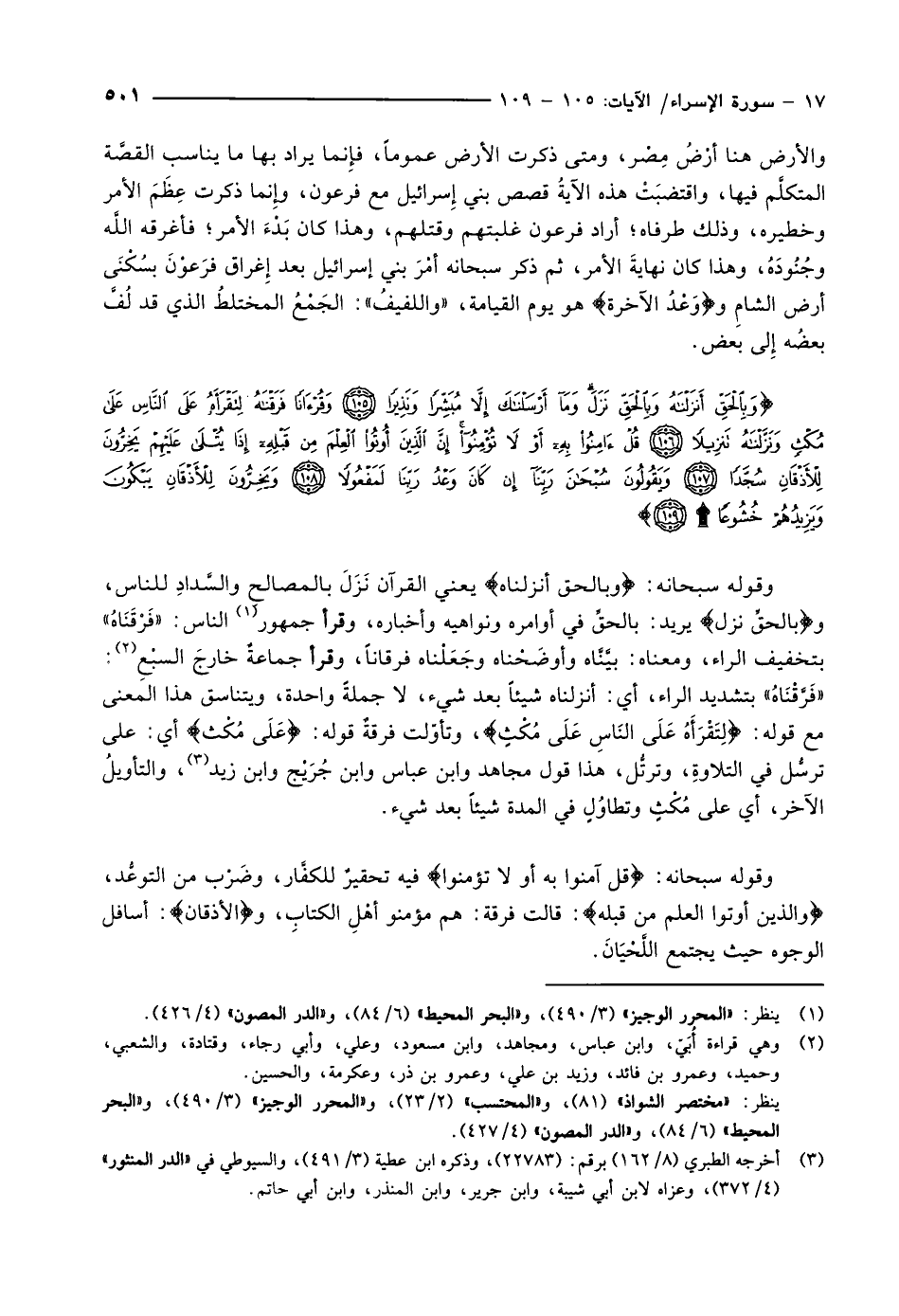 وَبِالْحَقِّ أَنْزَلْناهُ وَبِالْحَقِّ نَزَلَ وَما أَرْسَلْناكَ إِلاَّ مُبَشِّراً وَنَذِيراً (105) وَقُرْآناً فَرَقْناهُ لِتَقْرَأَهُ عَلَى النَّاسِ عَلى مُكْثٍ وَنَزَّلْناهُ تَنْزِيلاً (106) قُلْ آمِنُوا بِهِ أَوْ لا تُؤْمِنُوا إِنَّ الَّذِينَ أُوتُوا الْعِلْمَ مِنْ قَبْلِهِ إِذا يُتْلى عَلَيْهِمْ يَخِرُّونَ لِلْأَذْقانِ سُجَّداً (107) وَيَقُولُونَ سُبْحانَ رَبِّنا إِنْ كانَ وَعْدُ رَبِّنا لَمَفْعُولاً (108) وَيَخِرُّونَ لِلْأَذْقانِ يَبْكُونَ وَيَزِيدُهُمْ خُشُوعاً (109)