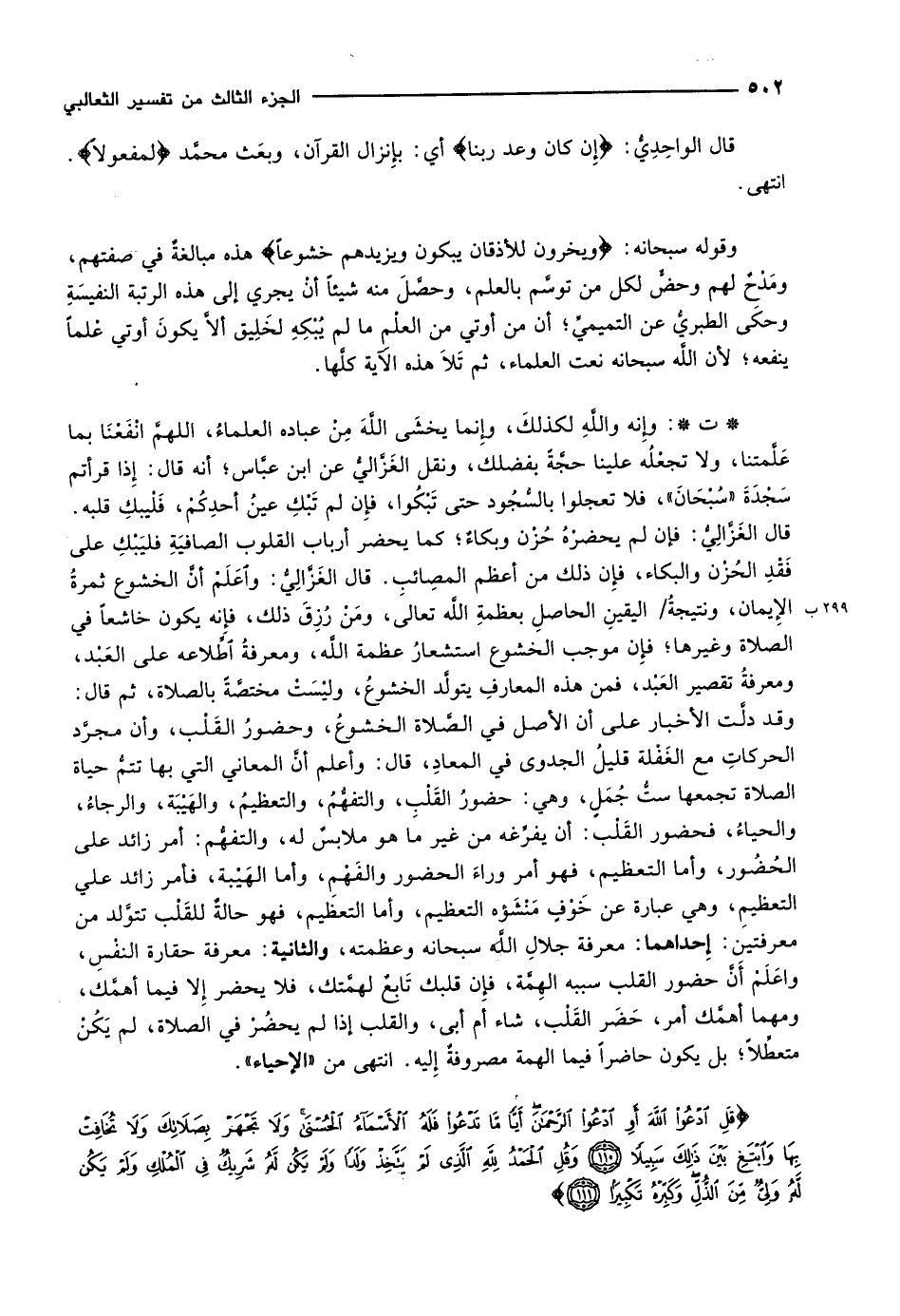 ت: وإِنه واللَّهِ لكذلكَ، وإِنما يخشَى اللَّهَ مِنْ عباده العلماءُ، اللهمَّ انْفَعْنَا بما عَلَّمتنا، ولا تجعْلُه علينا حجَّةً بفضلك، ونقل الغَزَّاليُّ عن ابن عبَّاس أنه قال: إِذا قرأتم سَجْدَةَ «سُبْحَانَ» ، فلا تعجلوا بالسُّجُود حتى تَبْكُوا، فإِن لم تَبْكِ عينُ أحدِكُمْ، فَلْيبكِ قلبه.