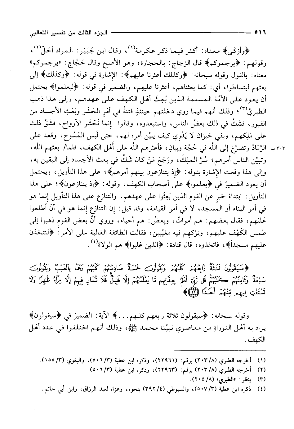 وقوله سبحانه: سَيَقُولُونَ ثَلاثَةٌ رابِعُهُمْ كَلْبُهُمْ ... الآية: الضميرُ في سَيَقُولُونَ يراد به أهْل التوراةِ من معاصري نبيّنا محمد صلّى الله عليه وسلّم، وذلك أنهم اختلفوا في عدد أهْل الكهف.