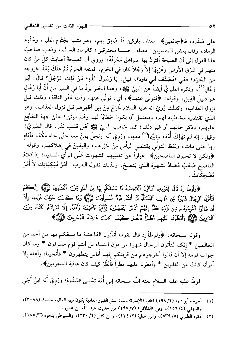 وقوله سبحانه: وَلُوطاً إِذْ قالَ لِقَوْمِهِ أَتَأْتُونَ الْفاحِشَةَ مَا سَبَقَكُمْ بِها مِنْ أَحَدٍ مِنَ الْعالَمِينَ إِنَّكُمْ لَتَأْتُونَ الرِّجالَ شَهْوَةً مِنْ دُونِ النِّساءِ بَلْ أَنْتُمْ قَوْمٌ مُسْرِفُونَ وَما كانَ جَوابَ قَوْمِهِ إِلَّا أَنْ قالُوا أَخْرِجُوهُمْ مِنْ قَرْيَتِكُمْ إِنَّهُمْ أُناسٌ يَتَطَهَّرُونَ فَأَنْجَيْناهُ وَأَهْلَهُ إِلَّا امْرَأَتَهُ كانَتْ مِنَ الْغابِرِينَ وَأَمْطَرْنا عَلَيْهِمْ مَطَراً فَانْظُرْ كَيْفَ كانَ عاقِبَةُ الْمُجْرِمِينَ.