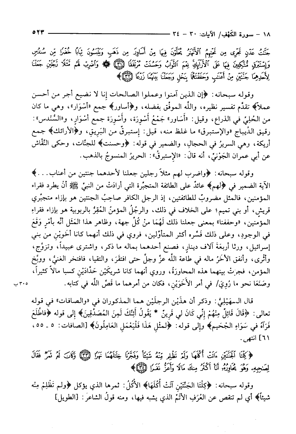 وقوله سبحانه: إِنَّ الَّذِينَ آمَنُوا وَعَمِلُوا الصَّالِحاتِ إِنَّا لاَ نُضِيعُ أَجْرَ مَنْ أَحْسَنَ عَمَلًا تقدّم تفسير نظيره، والله الموفّق بفضله، وأَساوِرَ جمع «أسْوَار» ، وهي ما كان من الحُلِيِّ في الذراع، وقيل: «أَسَاور» جَمْعُ أَسْوِرَة، وأَسْوِرَة جمع أسْوَارٍ، و «السُّنْدس» :