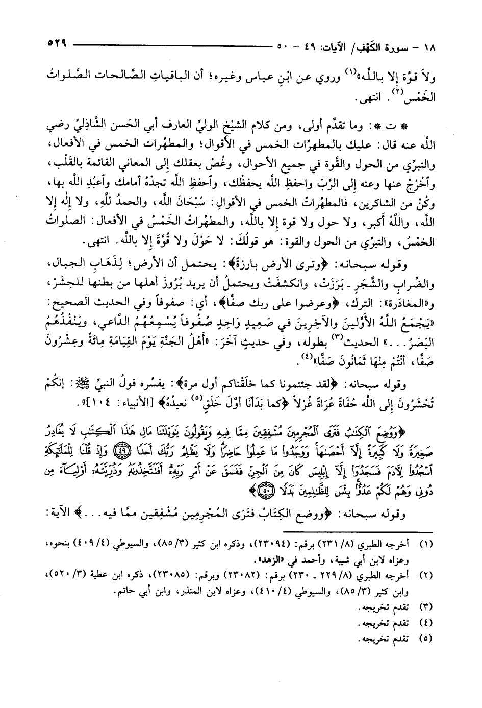 ت: وما تقدَّم أولى، ومن كلام الشيْخِ الوليِّ العارف أبي الحَسن الشَّاذِليِّ رضي اللَّه عنه قال: عليك بالمطهرِّات الخمس في الأقوال والمطهِّرات الخمس في الأفعال، والتبرِّي من الحول والقَّوة في جميع الأحوال، وغُصْ بعقلك إِلى المعاني القائمة بالقَلْب، واخرج عنها وعنه إِلى الرَّبّ واحفظِ اللَّه يحفظْك، واحفظ اللَّه تجدْهُ أمامك واعبد اللَّه بها، وكُنْ من الشاكرين، فالمطهِّراتُ الخمس في الأقوالِ: سُبْحَانَ اللَّه، والحمد لله، ولا إله إلا اللَّهُ، وَاللَّهُ أَكْبَرُ، وَلاَ حَوْلَ وَلاَ قُوَّةَ إلا بالله، والمطهِّراتُ الخَمْسُ في الأفعال: الصلواتُ الخمْسُ، والتبرِّي من الحول والقوة: هو قولُكَ: لا حَوْلَ ولا قوة إلا بالله. انتهى.